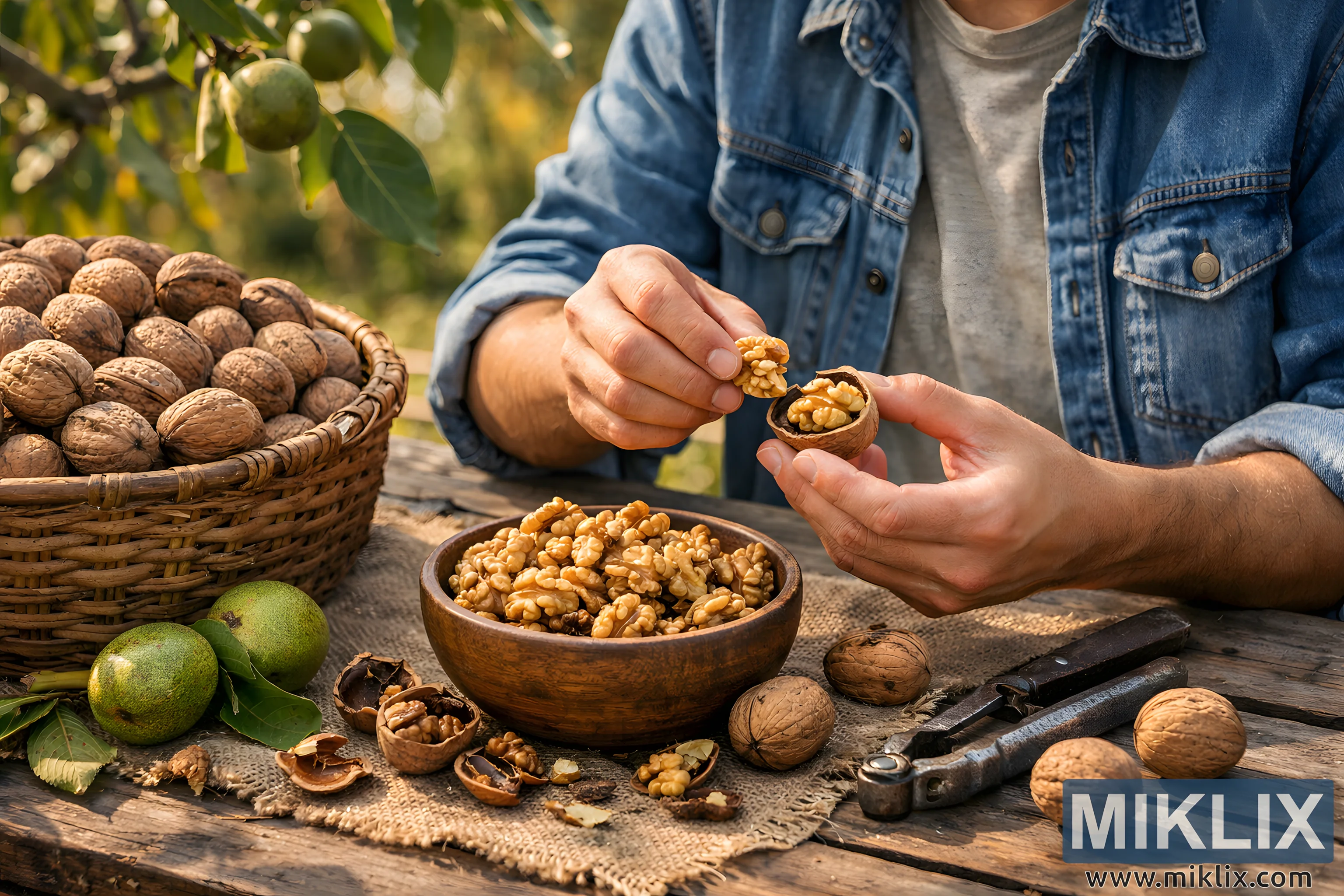 The image presents a warm, naturalistic outdoor scene centered on the quiet pleasure of enjoying freshly harvested walnuts. Set in a sunlit orchard during early autumn, the composition focuses on a person seated at a rustic wooden table, captured from the chest down so the emphasis remains on hands, textures, and objects rather than facial identity. The person wears a casual denim jacket over a light gray shirt, suggesting a relaxed, practical moment of harvest rather than a staged setting. Their hands are gently opening a walnut, carefully lifting the golden, brain-like kernel from the cracked shell, an action that conveys patience, satisfaction, and familiarity with the process.