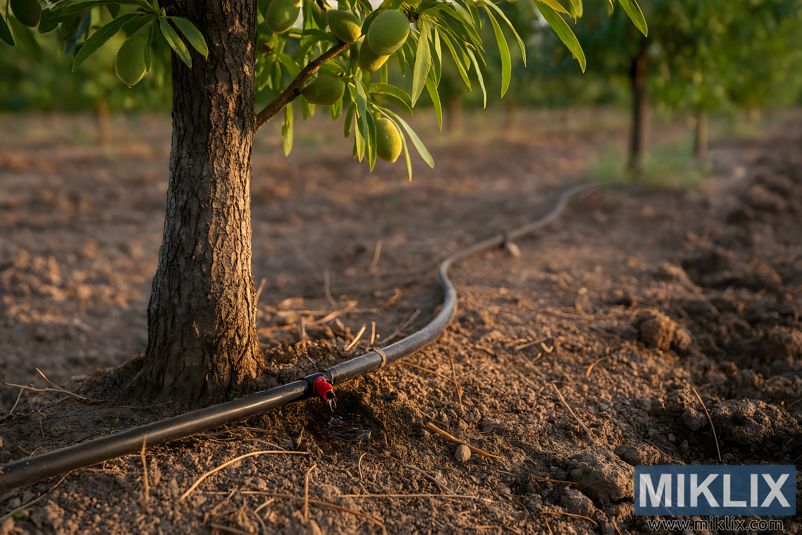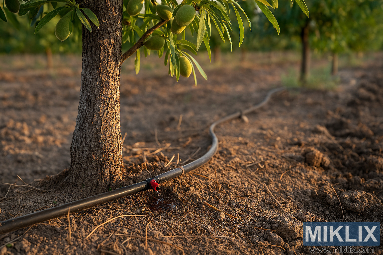 High-resolution landscape photo of a drip irrigation system encircling an almond tree in a sunlit orchard