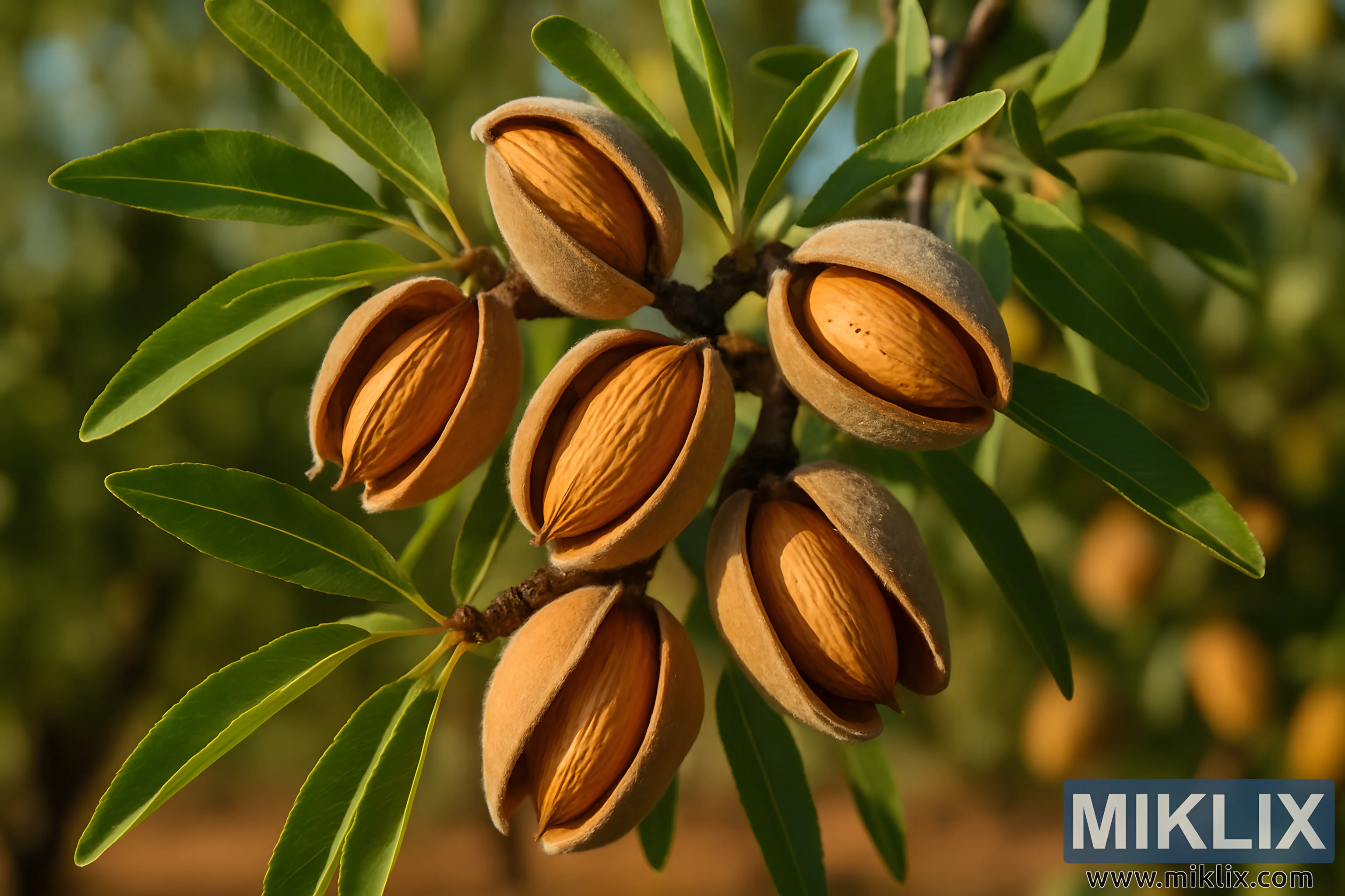 High-resolution close-up of ripe almonds with naturally split hulls on a tree branch, showcasing detailed textures and warm natural lighting.