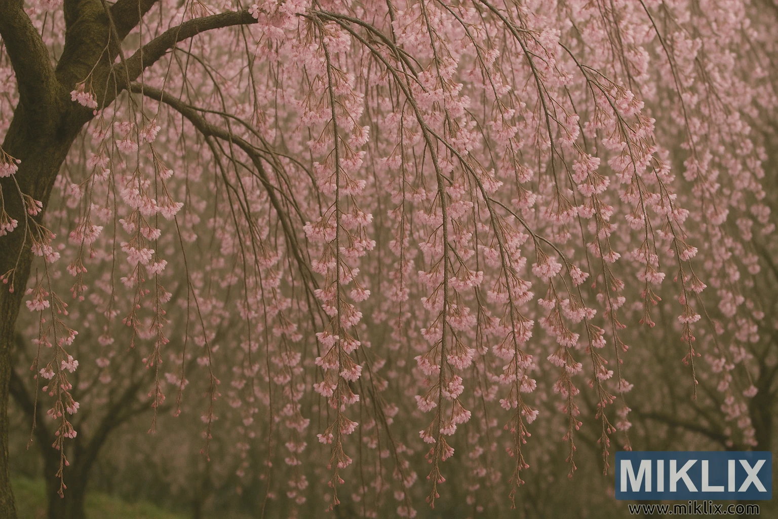 A weeping cherry tree displays cascading pink blossoms on slender branches, set in a serene garden with soft, dreamlike lighting and mossy trunk accents.