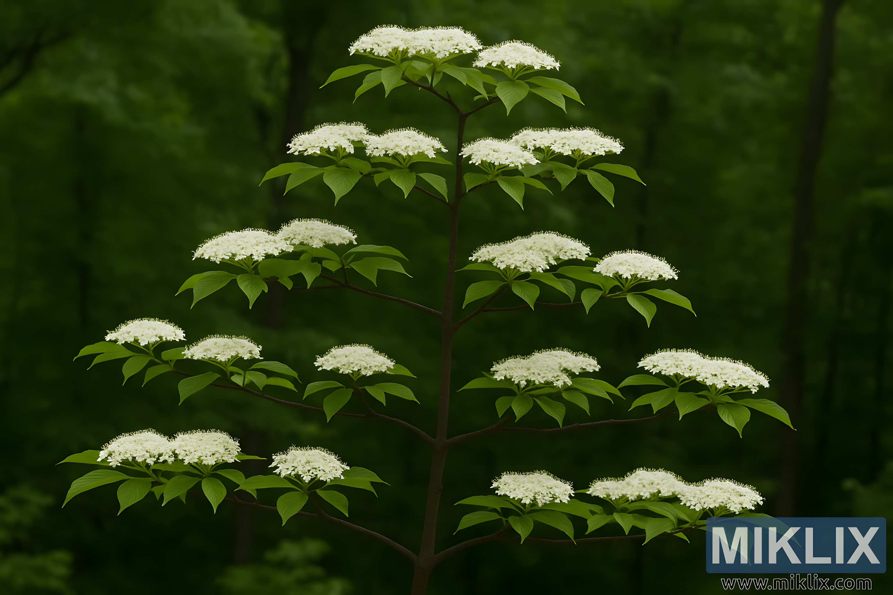 High-resolution photograph of a Pagoda Dogwood (Cornus alternifolia) showcasing its distinctive horizontal branching and clusters of delicate white blossoms, set against a verdant woodland backdrop.