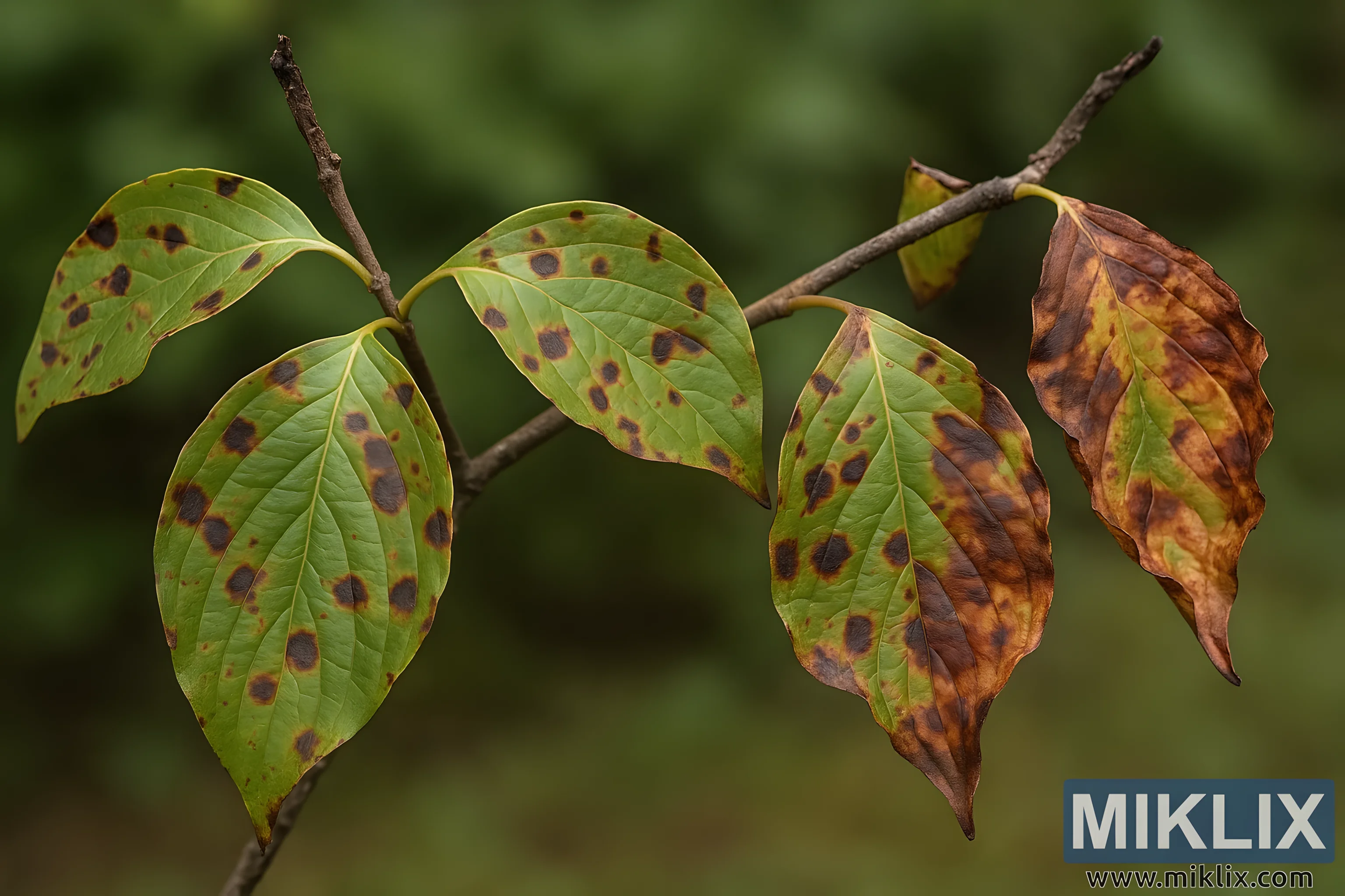 The image presents a high-resolution, landscape-oriented close-up of a dogwood branch affected by anthracnose, a fungal disease caused primarily by Discula destructiva. The composition centers on several elliptical dogwood leaves arranged along a thin, woody twig. The leaves are primarily green but exhibit widespread signs of infection in the form of irregularly shaped, dark brown to purplish lesions scattered across their surfaces. Each leaf shows varying degrees of damage: some have small, isolated spots, while others display extensive necrosis that causes browning and curling around the edges. The diseased tissue appears sunken and brittle, contrasting sharply with the still-living green portions of the leaves.