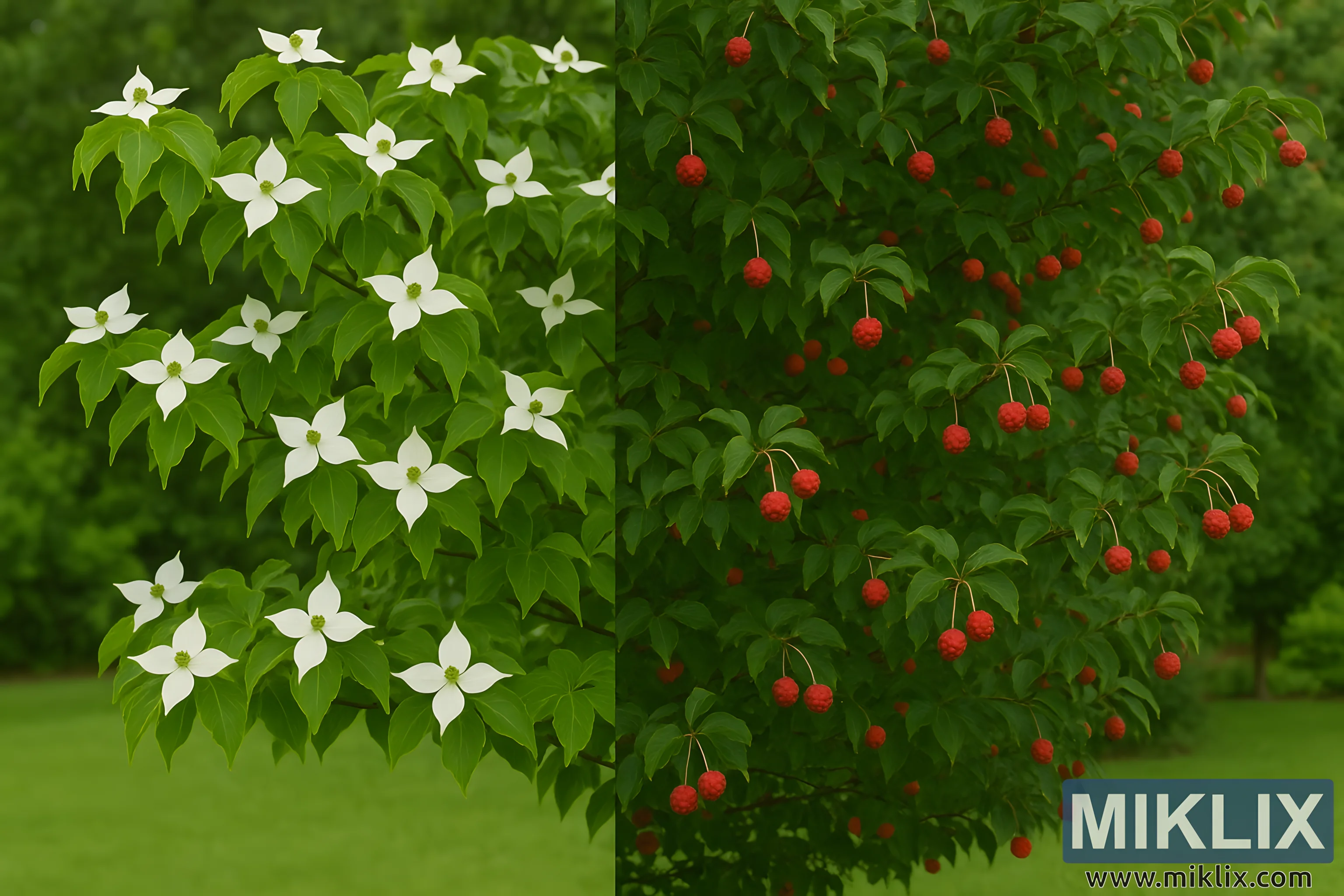 A clear 50/50 comparison of two Kousa Dogwood trees—one blooming with white bracts and the other bearing red fruits—separated by a distinct vertical divider.