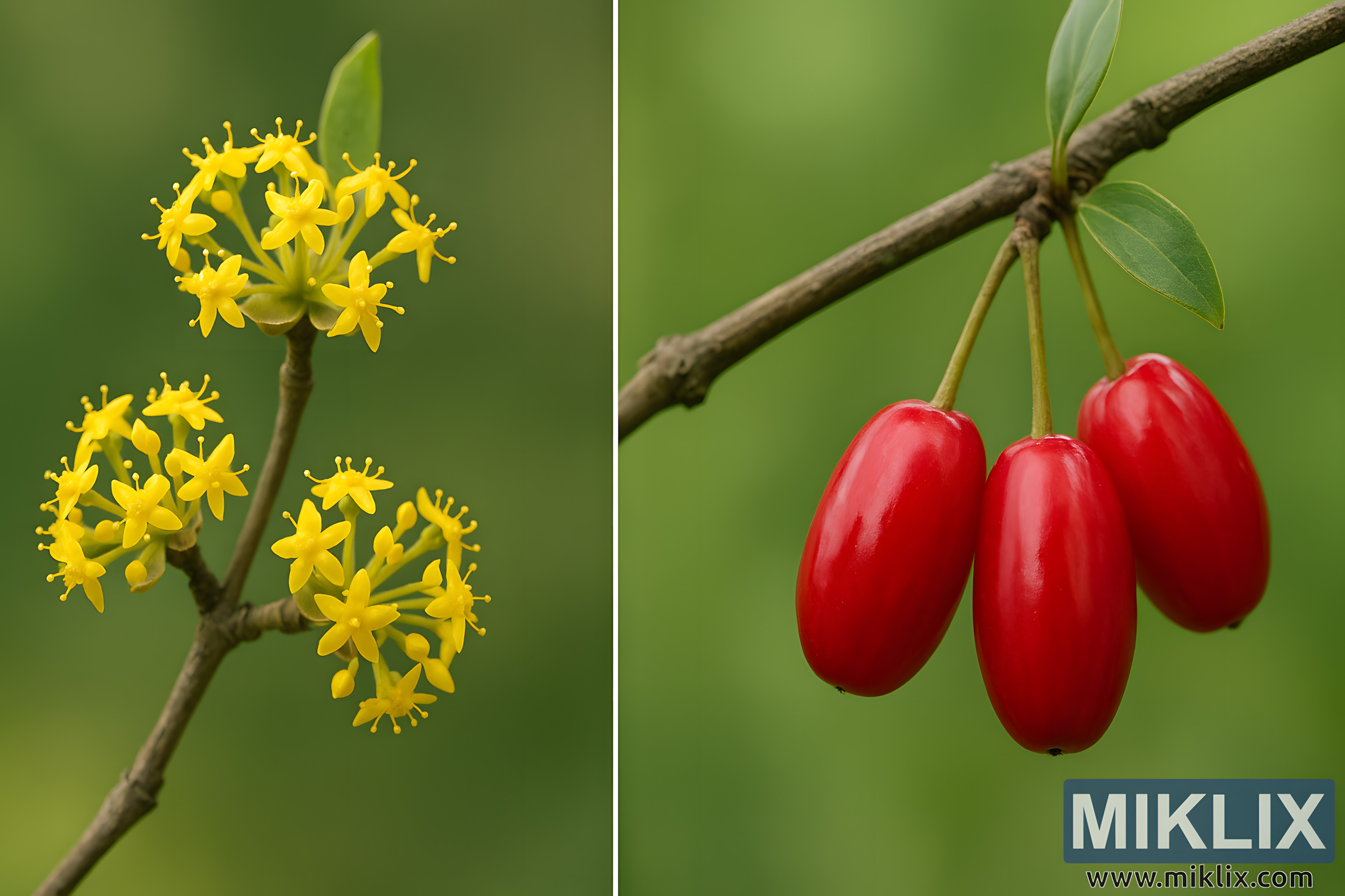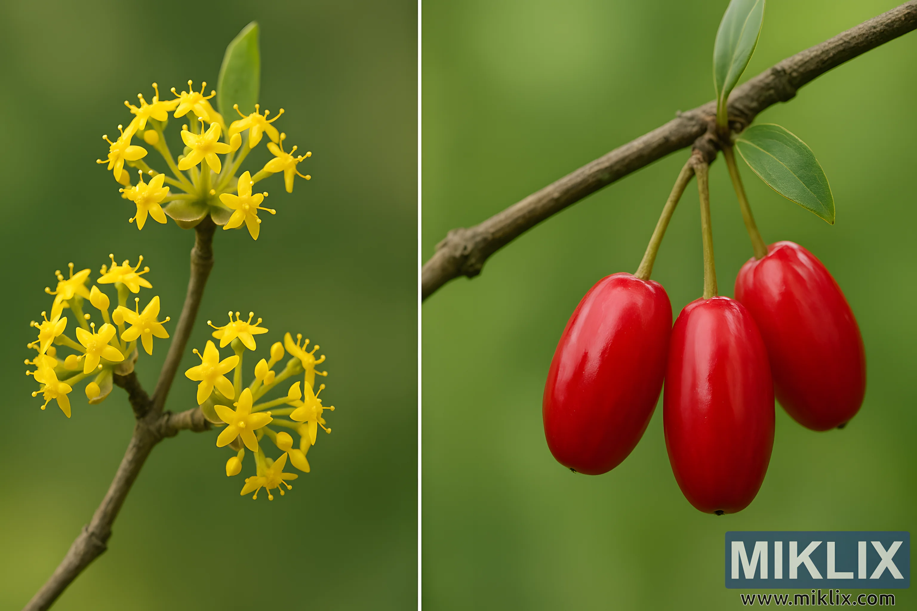 A detailed side-by-side comparison of Cornelian cherry dogwood branches, showing vibrant yellow flower clusters and glossy red fruits against a blurred green backdrop.