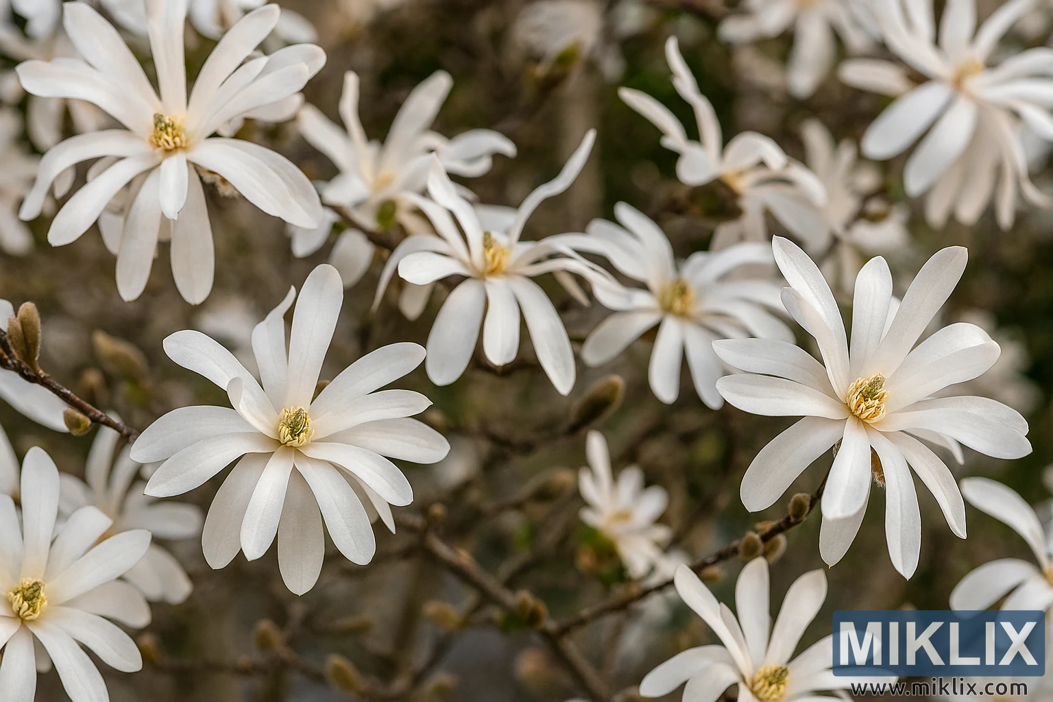 The image presents a breathtaking view of the Star Magnolia (Magnolia stellata) in full bloom during the early days of spring. The composition is set in a landscape orientation, allowing the viewer to take in a wide expanse of delicate blossoms that seem to float like stars against the backdrop of awakening nature. Each flower is composed of slender, elongated petals that radiate outward in a star-like formation, their pure white hue glowing softly in the natural light. The petals are slightly translucent, catching and diffusing sunlight in a way that creates subtle gradients of brightness, from luminous white at the center to a more muted, silken tone at the edges. Some petals overlap, adding depth and texture, while others curve gently, suggesting motion and fragility. At the heart of each blossom lies a cluster of golden-yellow stamens, dusted with pollen, surrounding a pale green pistil. This warm contrast against the cool white petals draws the eye inward, emphasizing the intricate structure of the flowers.