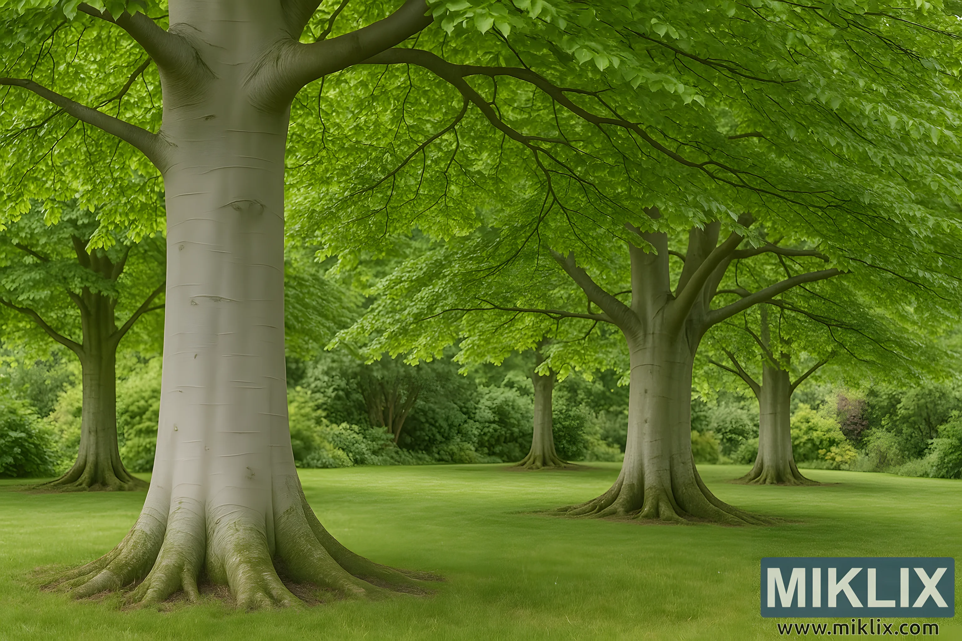 The lush green lawn beneath the trees adds to the sense of calm, its smooth expanse providing a perfect stage upon which the beeches stand. The soft grass contrasts with the commanding presence of the trunks, offering both color and texture to the composition. Around the perimeter, distant shrubs and mixed greenery soften the horizon, their muted tones providing depth without distracting from the central drama of the beech grove. In places, hints of other vegetation add subtle variation—patches of darker green, or a faint suggestion of warmer tones—yet the scene remains dominated by the unifying presence of the beeches themselves.