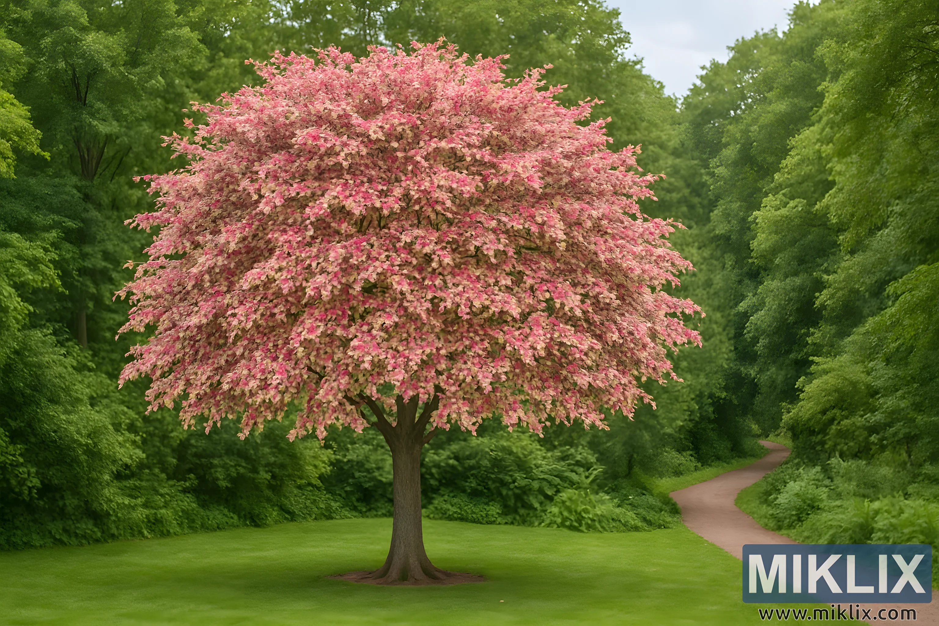 Surrounding the Tricolor Beech is a sea of verdant green, provided by the woodland edge that frames the scene. The dense backdrop of ordinary foliage only heightens the drama of the beech’s coloration, allowing the tree to stand forward like a jewel against velvet. This juxtaposition of rich greens with the variegated pinks and whites enhances the perception of depth and saturation, making the tree appear almost luminous. The winding garden path that curves softly into the distance adds both perspective and narrative, suggesting movement through the landscape, as if inviting a leisurely stroll beneath the canopy and beyond into the shaded recesses of the woodland.