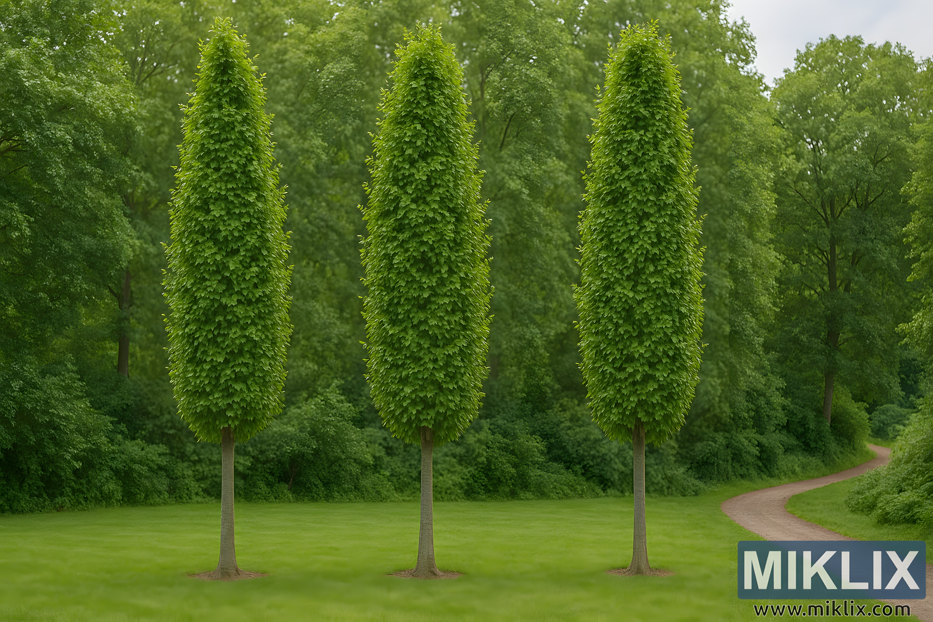 The dense canopy of each tree is packed with vibrant leaves, their glossy surfaces catching and reflecting light in shifting tones of green. This creates a textured surface that softens the rigid geometry of their shape, ensuring that while the trees remain formal in habit, they also radiate vitality and richness. Seen together, the three columns form a rhythmic sequence, almost like a procession of sentinels standing watch along the edge of the lawn. Their placement suggests both practical and aesthetic considerations, as they frame the view toward the softly curving garden path that meanders into the woodland backdrop. The path’s gentle bend contrasts with the vertical strictness of the trees, balancing the landscape with a sense of flow and movement.