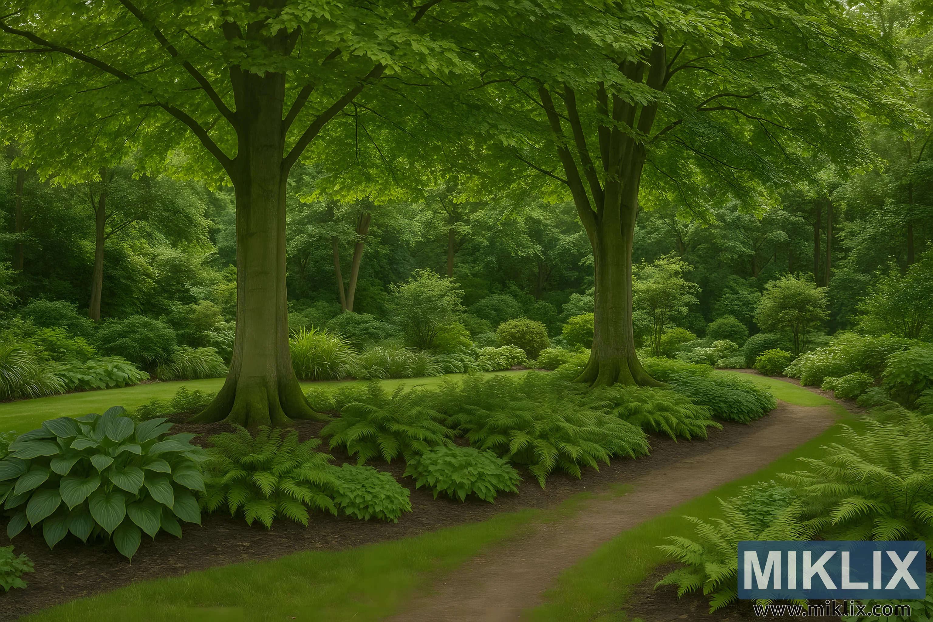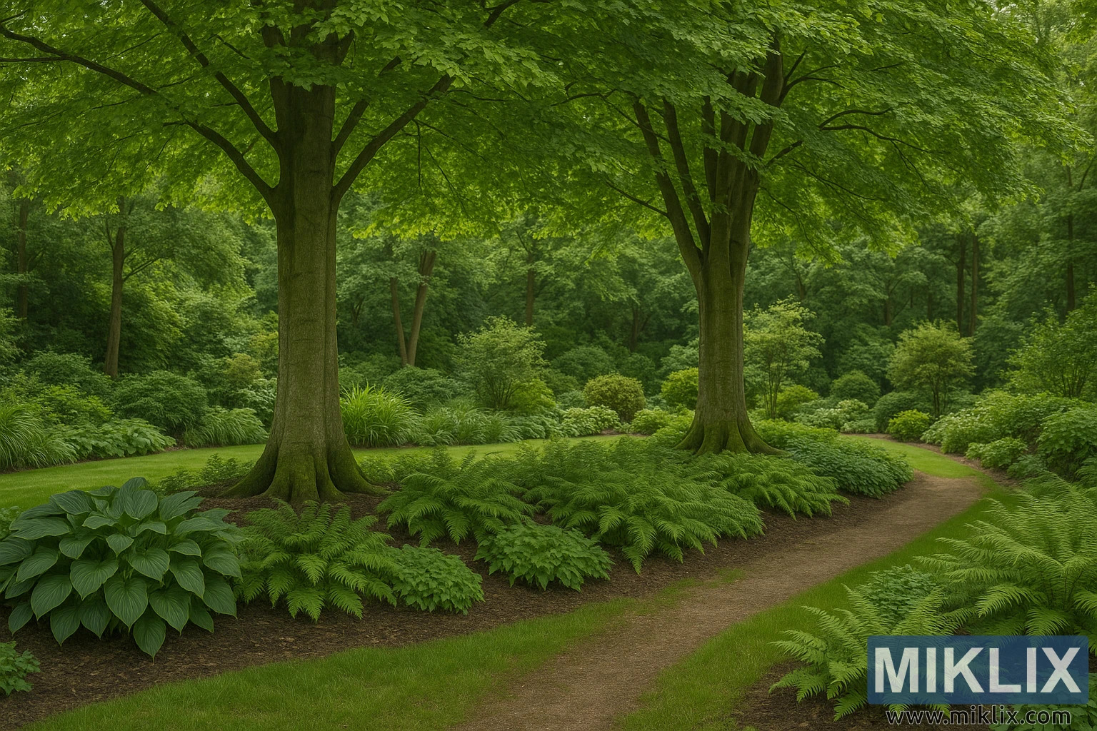 A tranquil woodland garden with European Beech trees forming a tall canopy above lush ferns and hostas, creating shade and natural harmony.