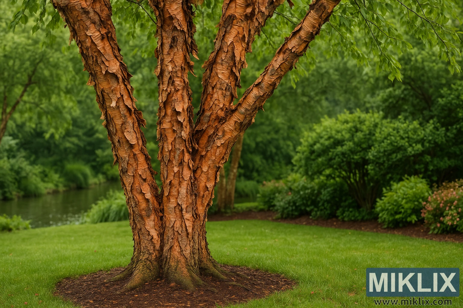 The trunk of the river birch is robust and immediately captures attention with its rich, reddish-brown to cinnamon-brown color. This bark is not smooth, but rather exhibits a spectacular, rugged texture, as it peels away in dramatic, thin, papery layers and curls. These curling strips of bark create an intricate, almost sculptural surface that is both visually fascinating and tactilely inviting. The peeling effect is pronounced across the entire visible trunk and extends up into the main scaffold branches, which themselves splay upwards and outwards from a common, strong base. This multi-stemmed or low-branching habit is characteristic of the species and is beautifully rendered here, with three prominent main trunks rising from a unified root crown. The light catches the edges of these curling bark layers, highlighting their delicate, papery quality and adding a subtle luminosity to the reddish tones.