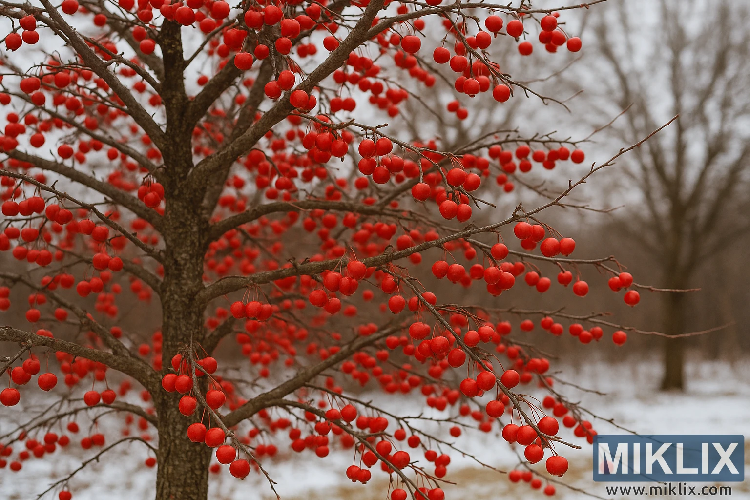 The photograph presents a captivating winter scene featuring a crabapple tree (Malus spp.) in full display of its ornamental and ecological beauty. Set against a backdrop of muted browns and grays typical of a winter landscape, the tree’s abundant, glossy red fruits become the central visual focus. Each small, round crabapple—ranging in size from a marble to a small cherry—clings tightly to thin, arching branches that radiate outward from the main trunk. The branches are devoid of leaves, emphasizing the intricate network of limbs that weave through the frame and creating a lacework of organic forms set against the softly blurred silhouettes of distant, leafless trees. A faint dusting of snow covers the ground and faintly whitens the bark, providing subtle contrast without overwhelming the scene. The color palette is dominated by deep reds and subdued neutral tones: the bright, saturated crimson fruits stand in vivid contrast to the desaturated brown bark and the pale winter background. The lighting appears diffuse, likely captured on an overcast day, which helps maintain balanced exposure across the image and enhances the saturation of the red fruit while avoiding harsh shadows or glare. The overall mood is serene and contemplative, evoking the quiet endurance of life through the cold season. The photograph subtly conveys ecological significance as well—crabapple trees like this one are known for their value to wildlife, particularly birds that feed on the persistent fruits throughout winter when other food sources are scarce. The crisp detail in the foreground fruit gradually transitions into a soft blur in the background, lending a sense of depth and emphasizing the tree’s sculptural form. The tree’s bark texture, the delicate stems of the fruits, and the fine frost on the branches are all rendered with remarkable clarity. Taken in landscape orientation, the composition balances intimacy and breadth: it draws the viewer close enough to appreciate the fine details of the fruit clusters while still revealing the larger context of the winter landscape in which the tree stands. This image embodies both botanical precision and natural artistry—it captures the enduring vibrancy of one of the best crabapple varieties for wildlife, standing resilient and colorful amid the stillness of winter. The overall impression is one of beauty through contrast: warmth within cold, color amid monotone, and life persisting quietly through the dormant season.