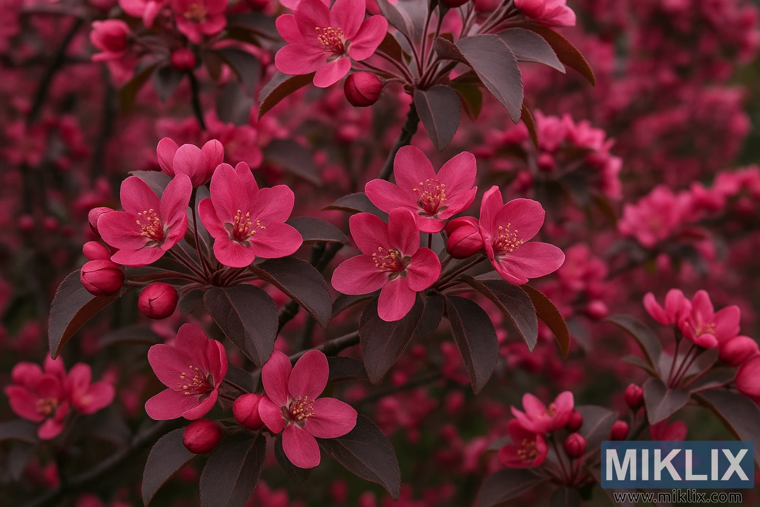 A stunning Prairiefire Crabapple tree in full bloom displays clusters of deep pink flowers and purple foliage. Celebrated for its beauty and disease resistance, this crabapple variety adds year-round ornamental value to any landscape.