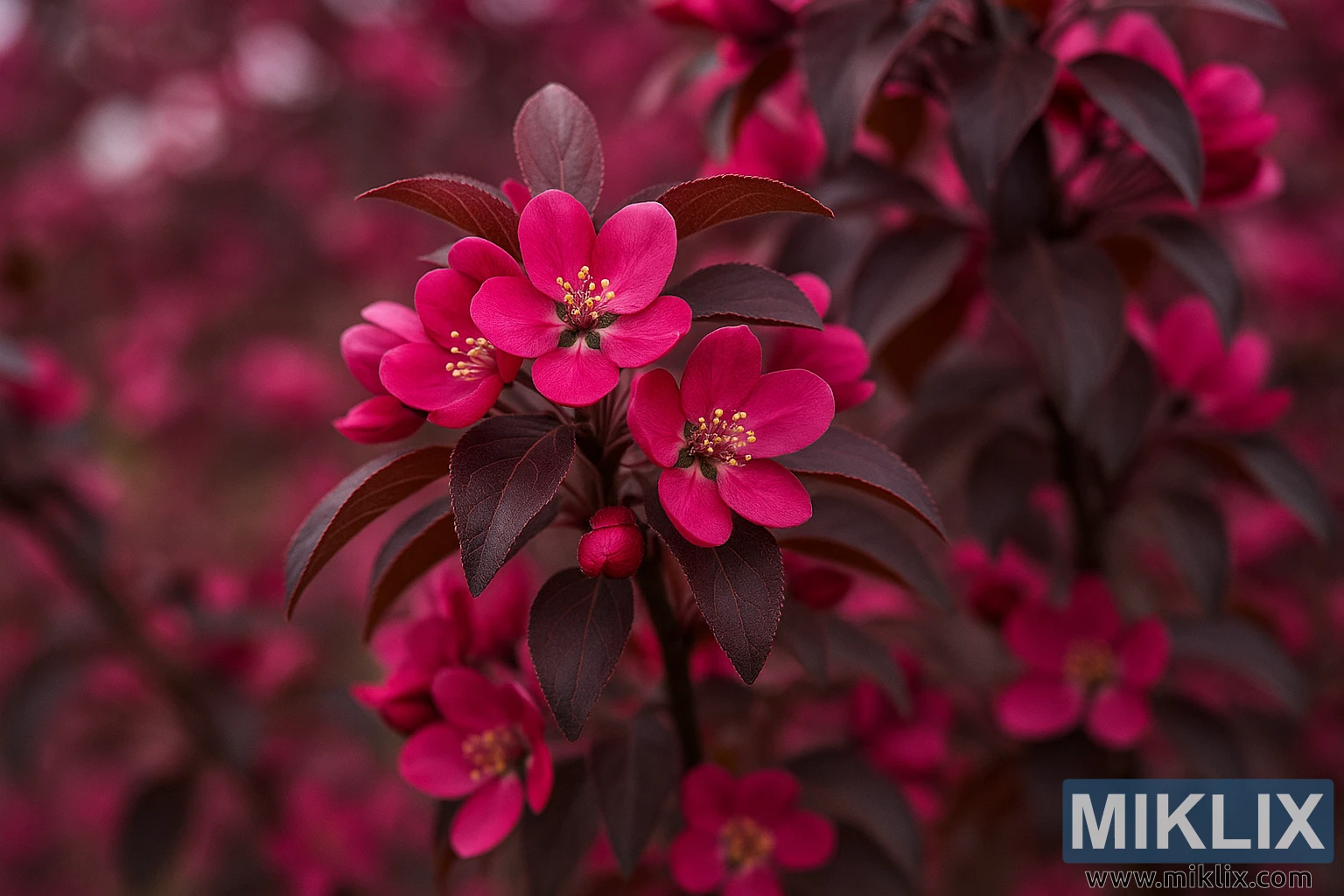 This high-resolution photograph captures the exquisite beauty of a Royal Raindrops Crabapple tree (Malus 'JFS-KW5') in full spring bloom. The image presents a striking composition where clusters of vivid magenta-pink flowers stand out against a backdrop of deep, glossy purple foliage. Each blossom displays five velvety petals surrounding a cluster of bright yellow stamens, which provide a luminous contrast and visual focal point within the frame. The intricate veining of the petals and the smooth texture of the leaves are rendered in sharp detail, showcasing the fine structure and vitality of the plant.
