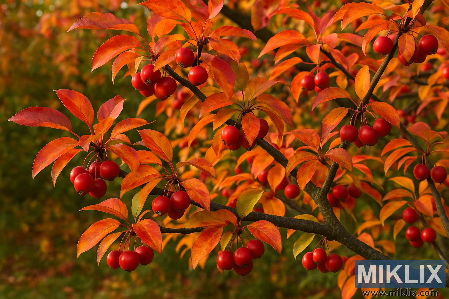 In horticultural terms, this image celebrates the best traits of ornamental crabapples: disease-resistant foliage, prolific fruiting, and intense autumn coloration. The combination of fine detail, natural lighting, and balanced composition makes the photograph not only a visual study in color and texture but also an artistic homage to one of the most versatile and visually rewarding small trees in temperate landscapes. It exemplifies how crabapple varieties contribute to the garden’s year-round appeal, particularly through their dazzling display of autumn interest.