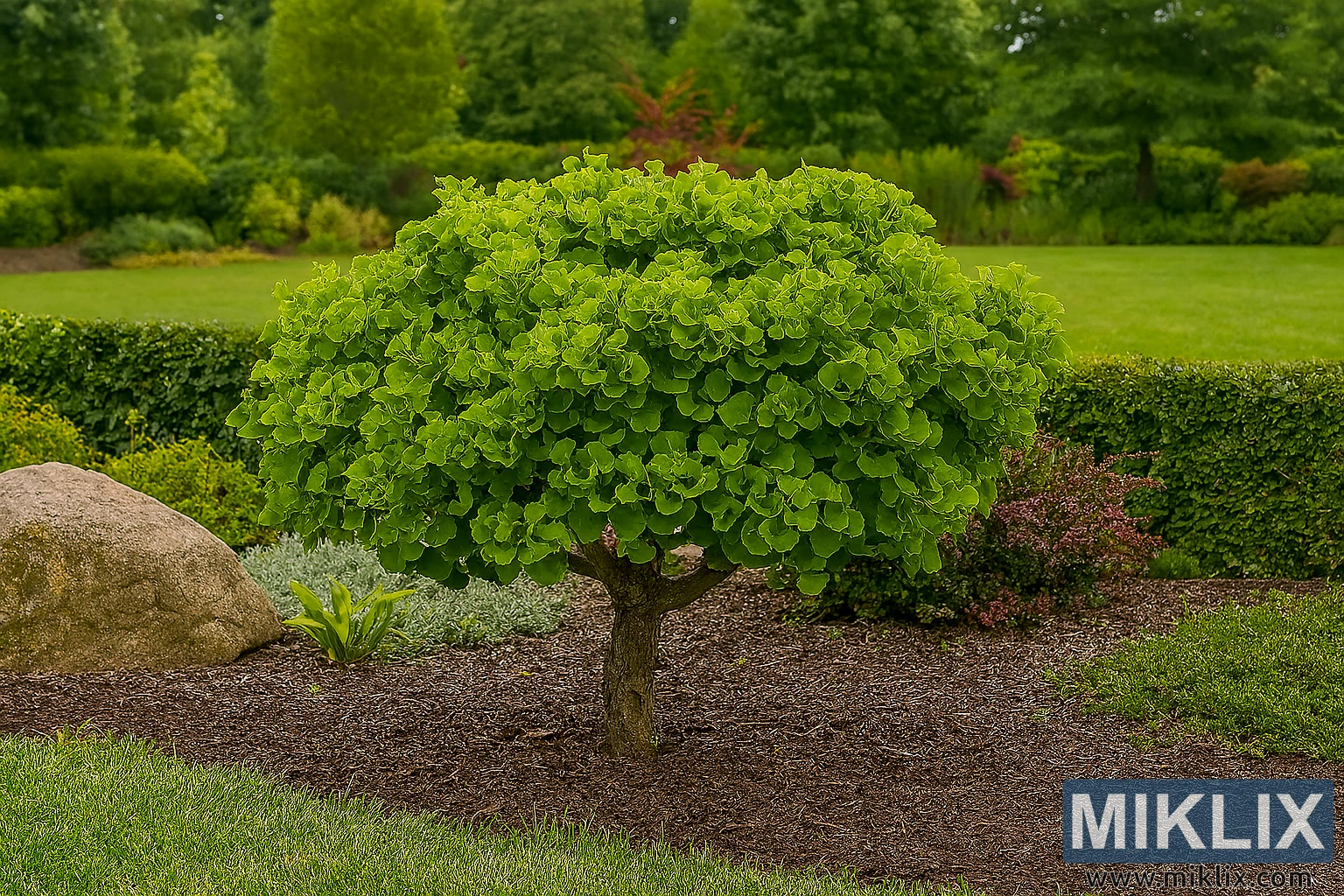 Discover the compact elegance of the Mariken dwarf ginkgo tree, perfect for small gardens and containers, showcased in a lush landscape with vibrant foliage and sculptural form.
