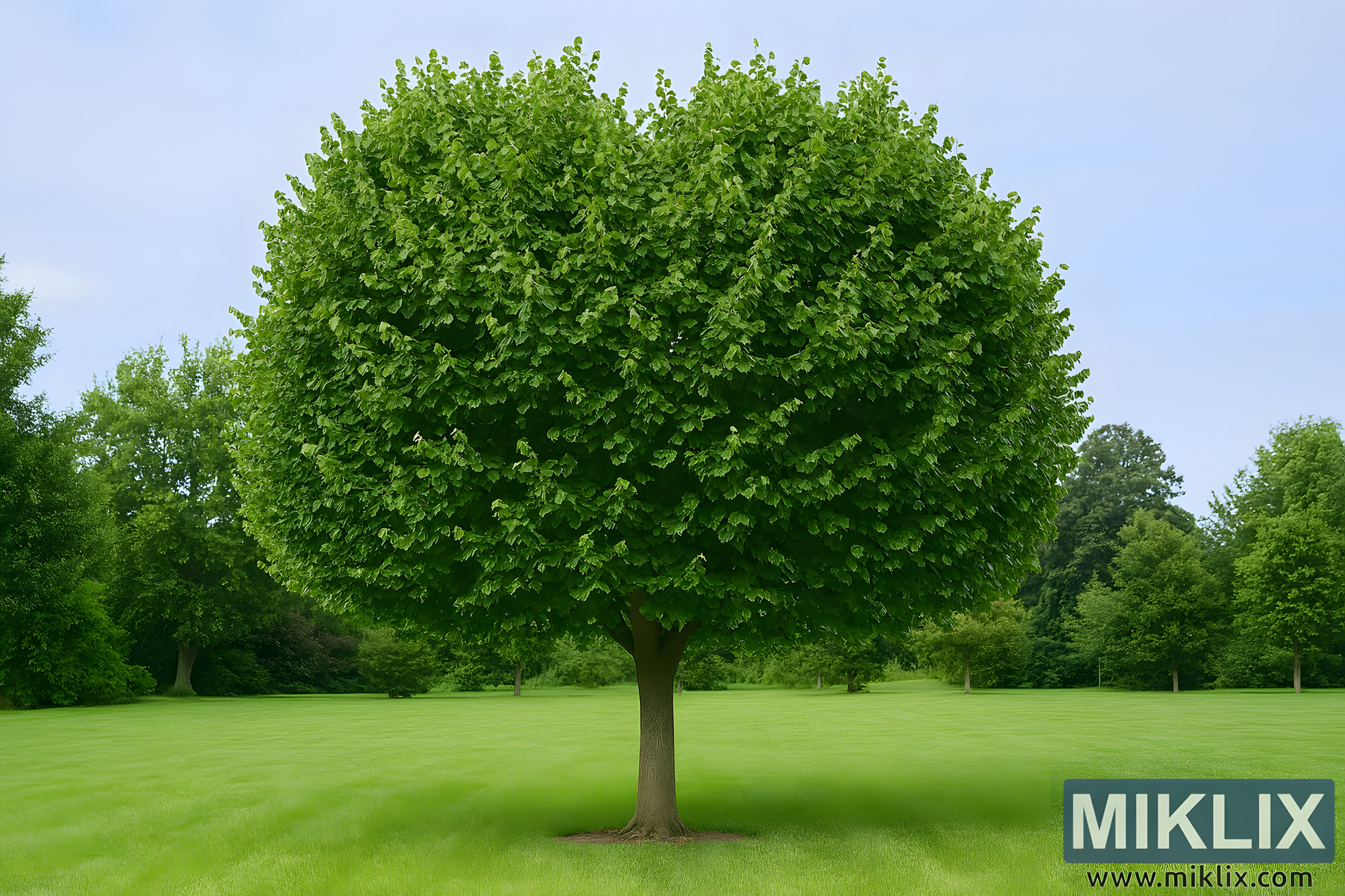 Explore the beauty of a mature Linden tree with a perfectly symmetrical canopy and heart-shaped leaves, ideal for ornamental garden landscapes.