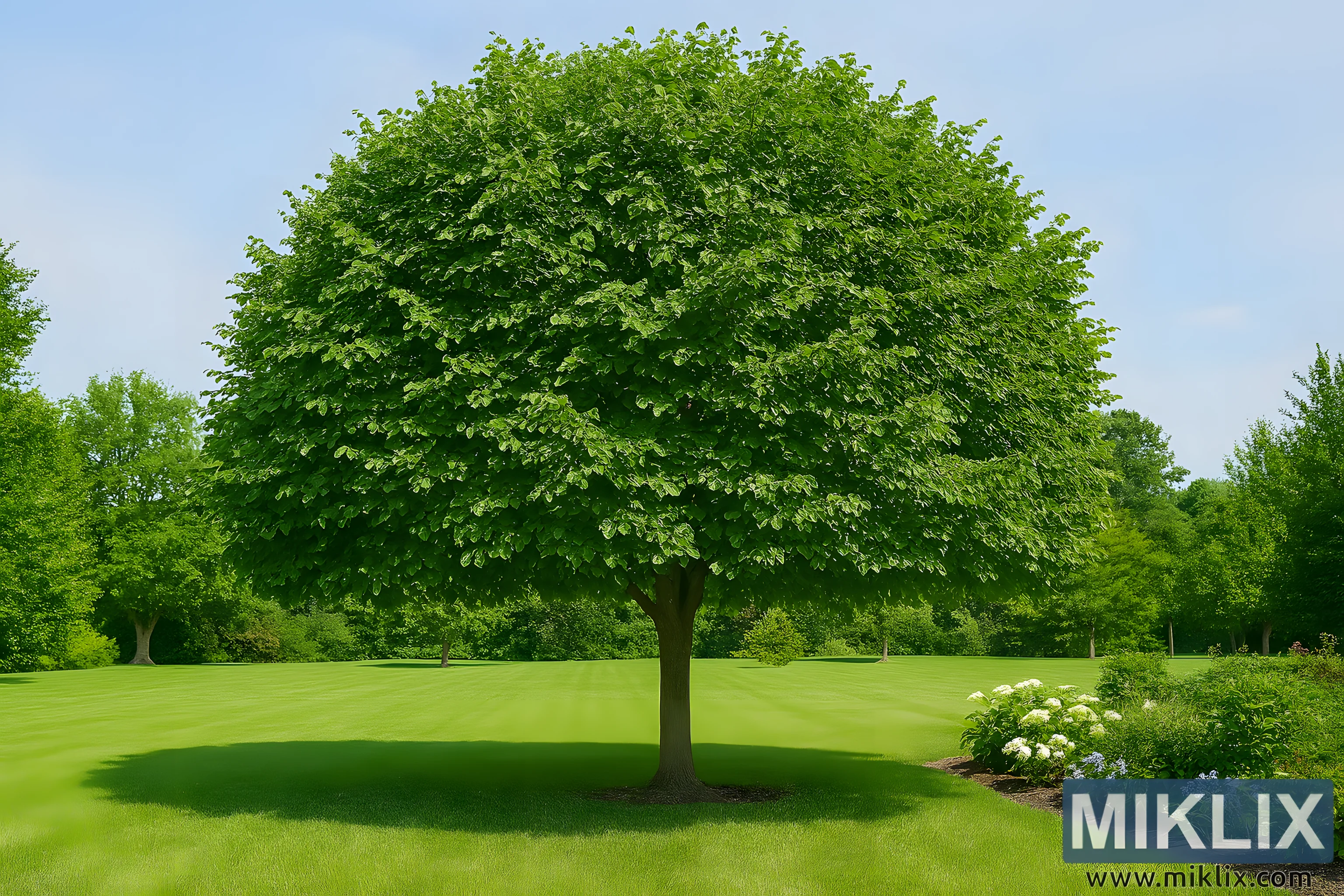 The overall composition is harmonious, with the Linden tree slightly off-center to allow spatial flow. The image communicates tranquility, shade, and botanical elegance—qualities that make Linden trees a top choice for garden landscapes. It’s a compelling visual for horticultural education, landscape design portfolios, or promotional materials for tree nurseries and garden centers.