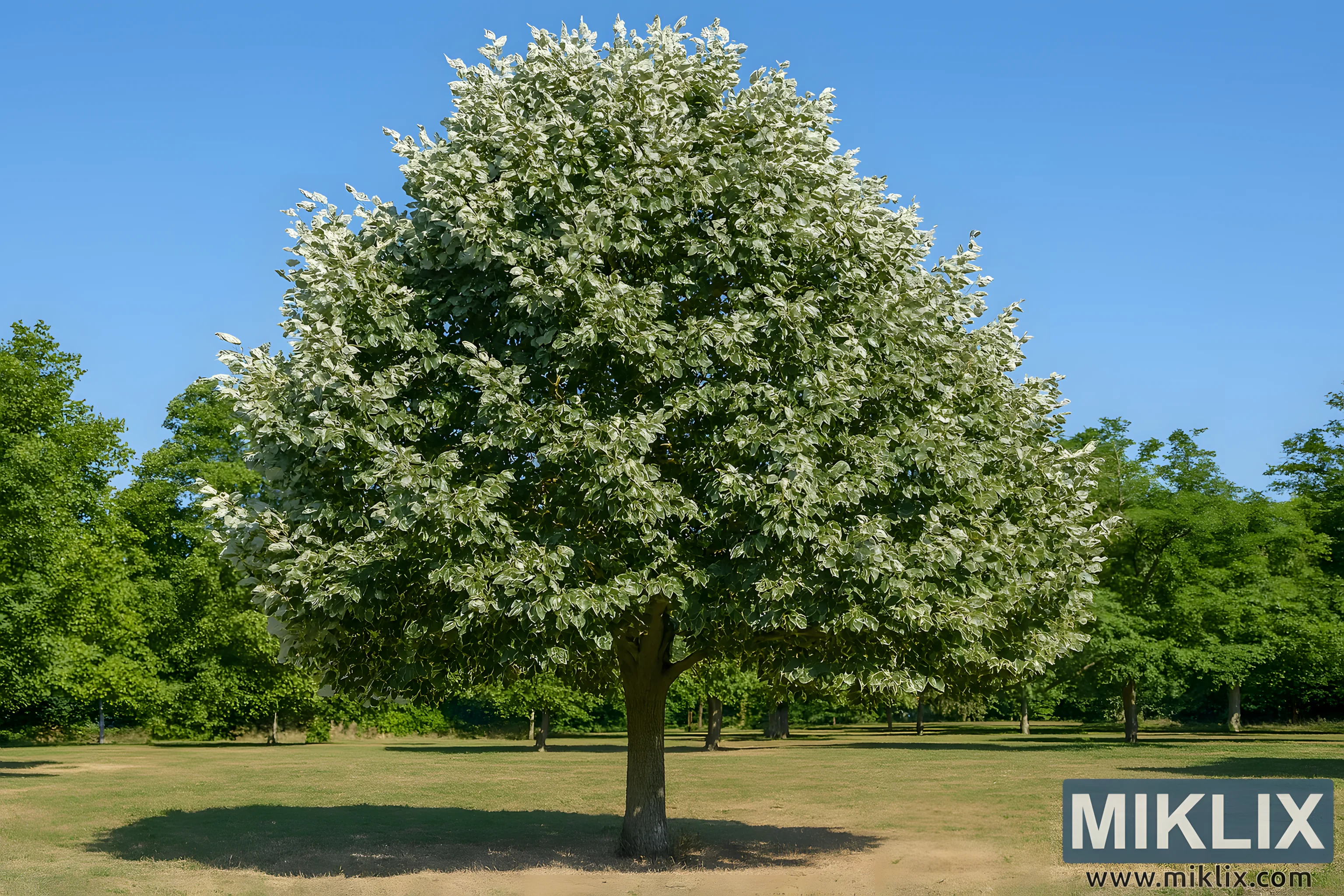 In the background, a loose arrangement of deciduous trees lines the horizon, their varied heights and forms adding depth without distracting from the central subject. These trees are spaced to allow glimpses of the sky and to frame the Silver Linden naturally within the garden’s broader design. The overall composition is balanced and serene, evoking a sense of resilience and elegance—qualities that make the Silver Linden one of the most desirable choices for dry-climate gardens.
