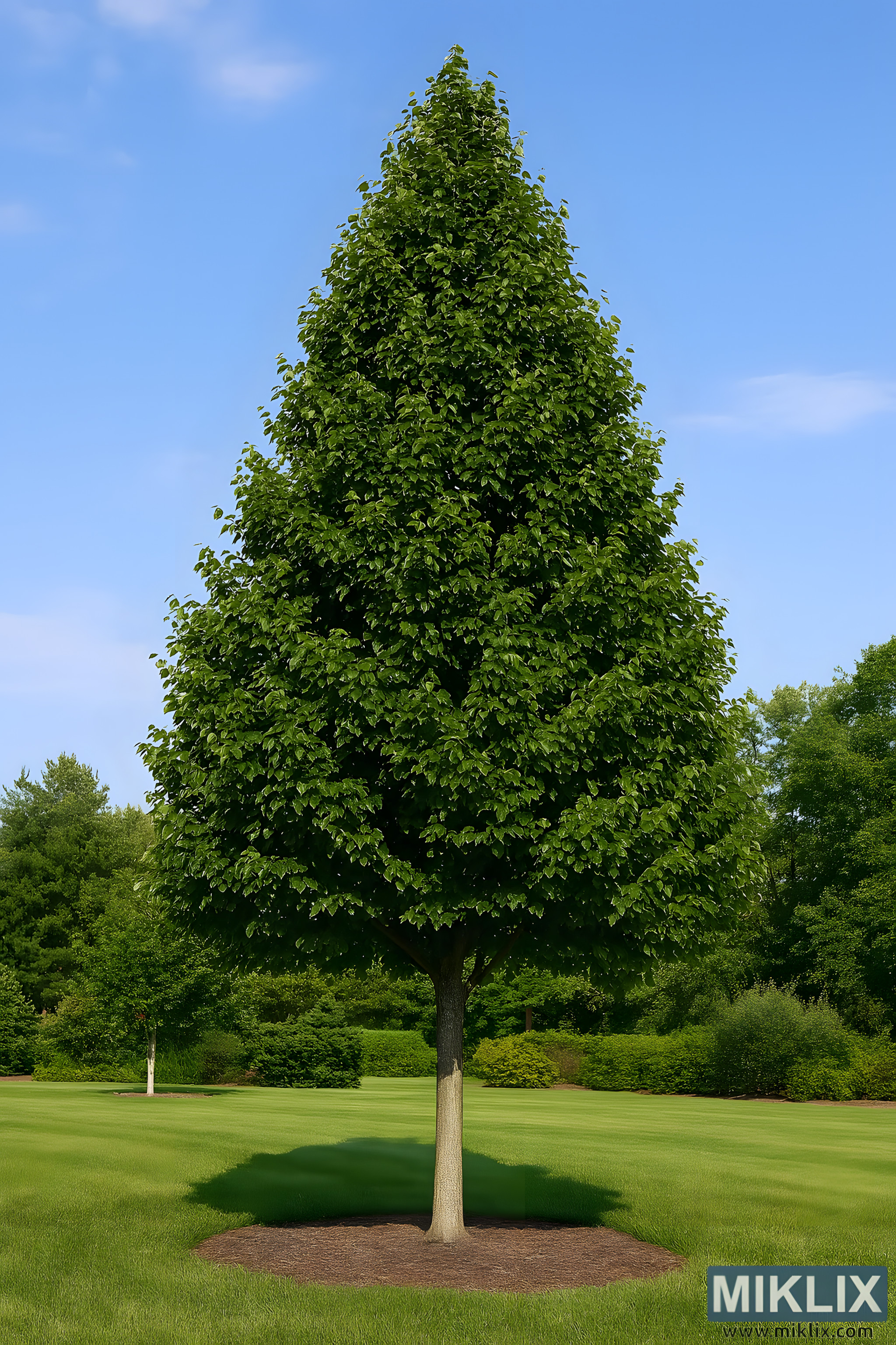 High-resolution image of a Greenspire Linden tree showcasing its perfect pyramidal form, ideal for structured garden landscapes and formal design aesthetics.