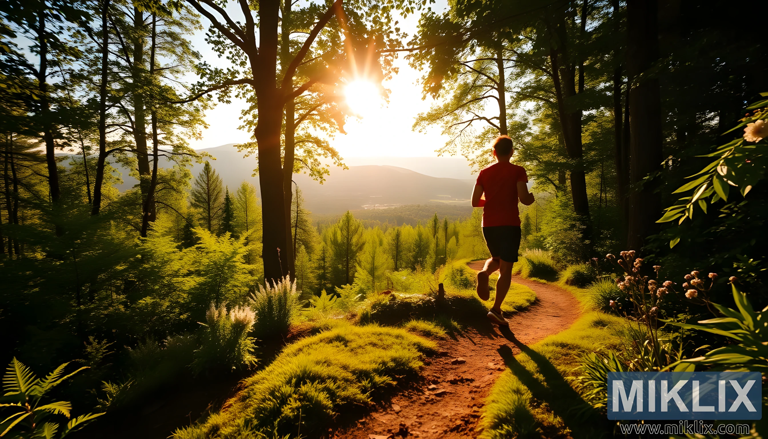આ છબી સમયની એક તેજસ્વી ક્ષણને કેદ કરે છે, જ્યાં પ્રકૃતિ અને માનવ જીવનશક્તિ સુખાકારીની એક જ, સુમેળભરી અભિવ્યક્તિમાં ભળી જાય છે. દ્રશ્યના કેન્દ્રમાં, લાલ શર્ટ અને ઘેરા શોર્ટ્સ પહેરેલો એક દોડવીર વળાંકવાળા જંગલના માર્ગ પર આગળ વધે છે. તેજસ્વી, નીચા લટકતા સૂર્ય સામે સિલુએટ કરાયેલ તેમનું આકૃતિ ઊર્જા અને નિશ્ચયને ઉજાગર કરે છે. દરેક ડગલું હેતુપૂર્ણ અને સહેલું લાગે છે, એક લય જે જંગલના જ ધબકારાને પડઘો પાડે છે. તેમના પગ નીચેનો રસ્તો સોના અને પીળા રંગના ગરમ રંગોથી ઝળહળે છે, ઉપરના ઊંચા છત્રમાંથી સૂર્યપ્રકાશ અને પડછાયાના આંતરપ્રક્રિયાથી માટી છલકાઈ રહી છે. એવું લાગે છે કે માર્ગ વ્યક્તિગત આમંત્રણ તરીકે પ્રકાશિત થયો છે, જે દોડવીરને પ્રકૃતિના અભયારણ્યમાં વધુ ઊંડાણમાં જવા માટે પ્રોત્સાહિત કરે છે.