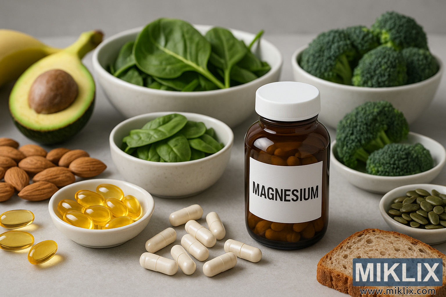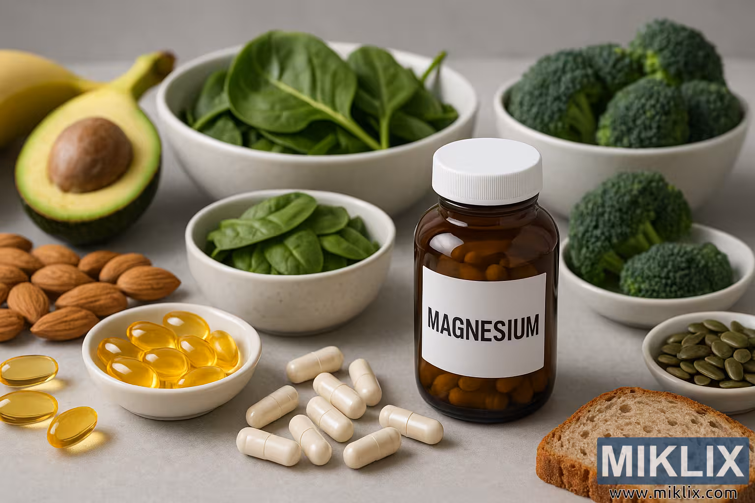 પાલક, એવોકાડો, બદામ, બીજ, કેળા અને બ્રેડથી ઘેરાયેલા કેપ્સ્યુલ્સ અને સોફ્ટજેલ્સ સાથે મેગ્નેશિયમની એમ્બર બોટલ, જે કુદરતી પોષક સ્ત્રોતોને પ્રકાશિત કરે છે.