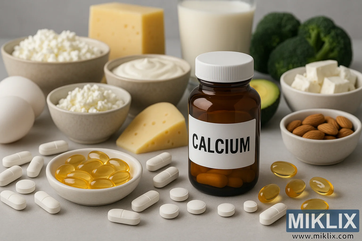 દૂધ, ચીઝ, દહીં, ઈંડા, બ્રોકોલી, બદામ અને એવોકાડોથી ઘેરાયેલા ગોળીઓ અને સોફ્ટજેલ્સ સાથે કેલ્શિયમ સપ્લિમેન્ટ્સની એમ્બર બોટલ, હાડકાના સ્વાસ્થ્યને ટેકો આપે છે.