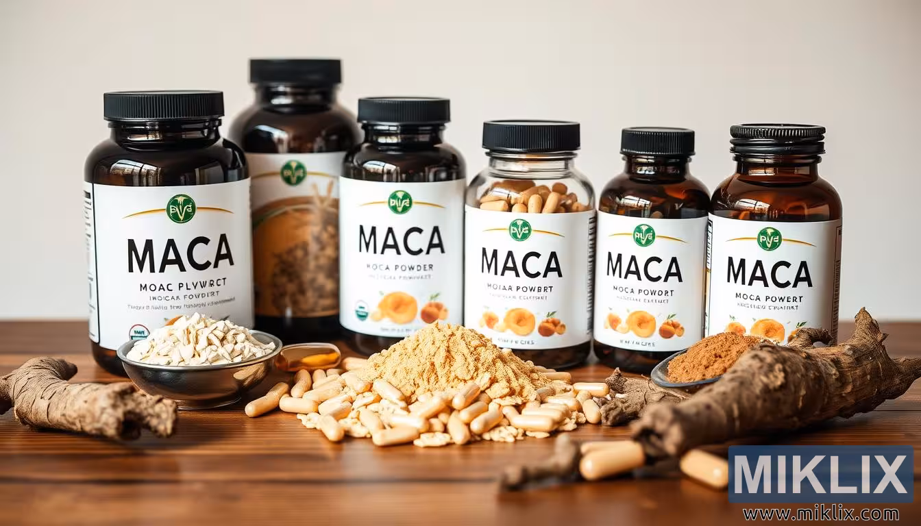 નરમ, કુદરતી પ્રકાશ સાથે લાકડાના ટેબલ પર ગોઠવાયેલા પાવડર, કેપ્સ્યુલ્સ અને અર્ક સહિત મકા રુટ સપ્લિમેન્ટ્સનો ક્લોઝ-અપ.