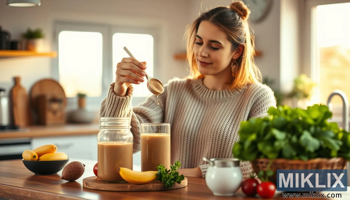 રસોડાના શાંત દ્રશ્યમાં એક મહિલા મકાના મૂળના પાવડર, તાજા ફળો અને લીલા શાકભાજીથી સ્મૂધી બનાવી રહી છે, જે સંતુલન, સુખાકારી અને પોષણનું પ્રતીક છે.