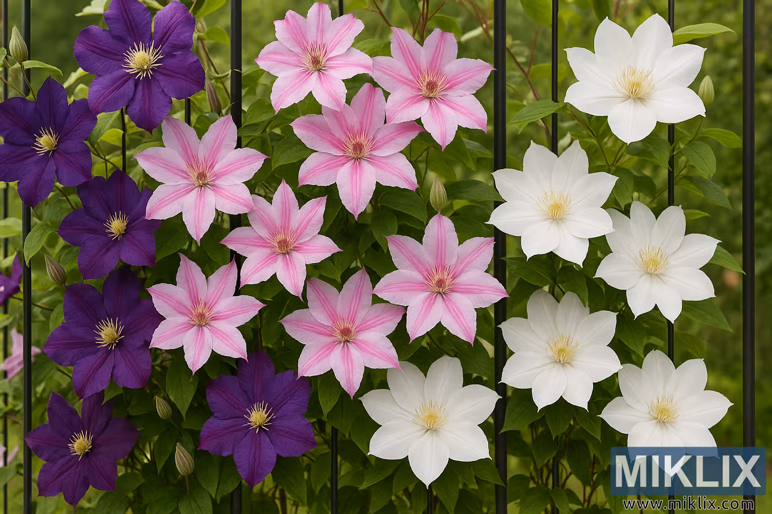 આ છબી એક જીવંત, ઉચ્ચ-રિઝોલ્યુશન ફોટોગ્રાફ છે જે સંપૂર્ણ ખીલેલા ક્લેમેટિસ ફૂલોથી ભરેલા એક આકર્ષક બગીચાના દૃશ્યને કેદ કરે છે. આ ઉત્કૃષ્ટ ચડતા છોડ મજબૂત કાળા ધાતુના ટ્રેલીસ પર સુંદર રીતે વણાયેલા છે, જે રંગ અને પોતની જીવંત ટેપેસ્ટ્રી બનાવે છે. રચના સુમેળભરી અને સંતુલિત છે, જેમાં ક્લેમેટિસ ફૂલોની ત્રણ મુખ્ય જાતો છે - ઊંડા શાહી જાંબલી, નરમ બ્લશ ગુલાબી અને નૈસર્ગિક સફેદ - એક રસદાર, કુદરતી ગોઠવણીમાં ભળી જાય છે.