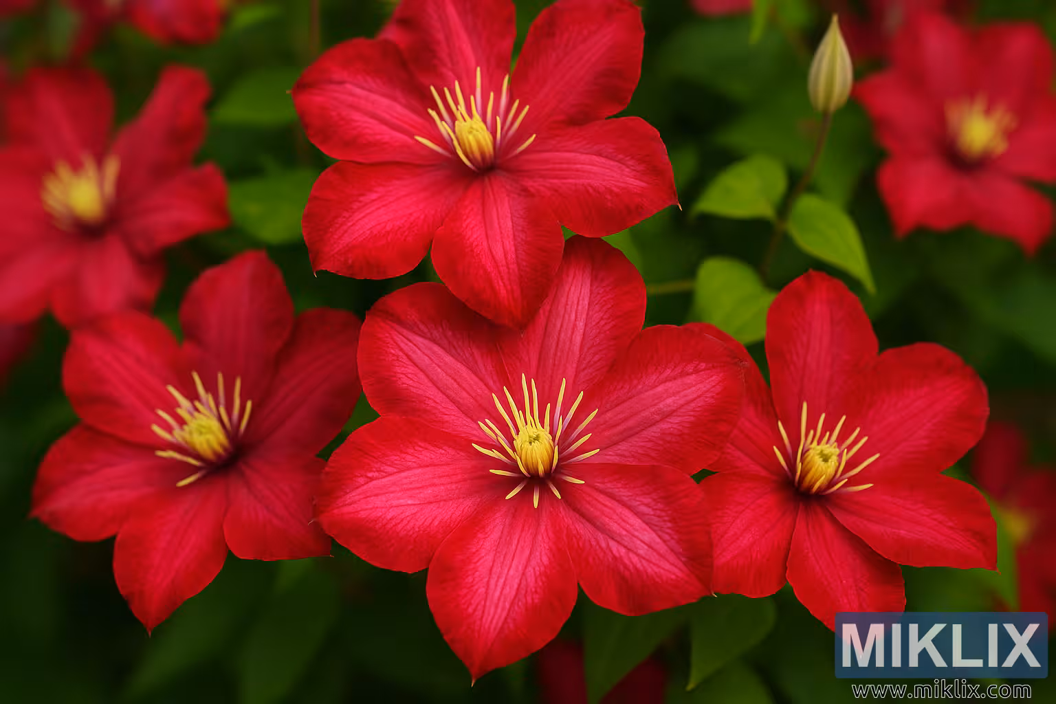 આ છબી ક્લેમેટિસ 'વિલે ડી લિયોન' નો અદભુત, ઉચ્ચ-રિઝોલ્યુશન ક્લોઝ-અપ ફોટોગ્રાફ છે, જે તેના તીવ્ર જીવંત લાલ ફૂલો માટે જાણીતી સૌથી આકર્ષક અને પ્રશંસનીય ક્લેમેટિસ કલ્ટીવર્સમાંથી એક છે. લેન્ડસ્કેપ ઓરિએન્ટેશનમાં કેદ કરાયેલ, આ રચના દર્શકને એક લીલાછમ વનસ્પતિ દ્રશ્યમાં ડૂબાડી દે છે જે ખુલવાના વિવિધ તબક્કામાં મખમલી, તારા આકારના ફૂલોથી ભરપૂર છે. આ ફોટોગ્રાફ ખૂબ જ વિગતવાર છે, જે સમૃદ્ધ લીલા પર્ણસમૂહની પૃષ્ઠભૂમિ સામે ફૂલોની જટિલ રચના, પોત અને રંગ ઢાળને છતી કરે છે.