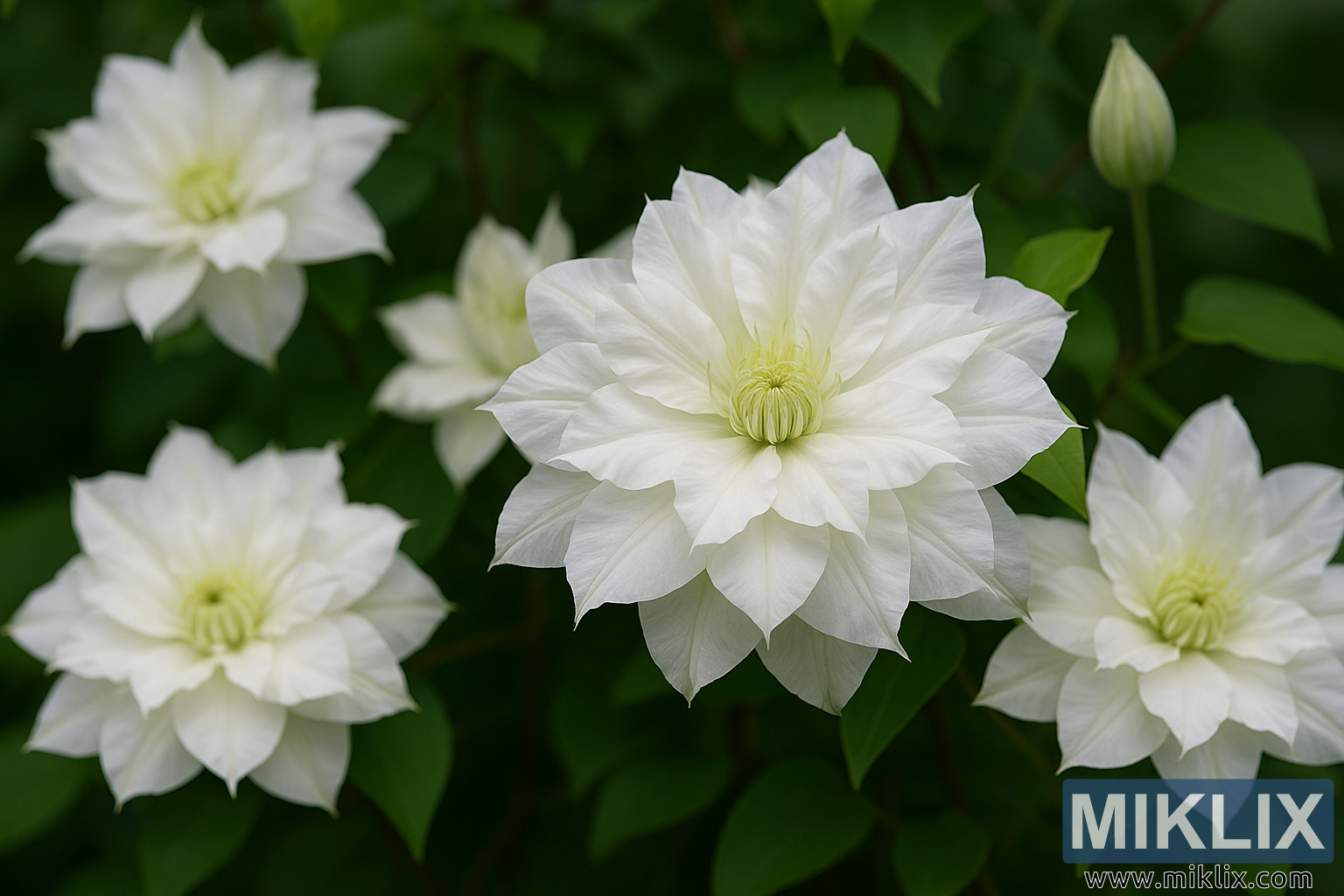 આ છબી ક્લેમેટિસ 'ડચેસ ઓફ એડિનબર્ગ' નો ઉચ્ચ-રિઝોલ્યુશન, ક્લોઝ-અપ ફોટોગ્રાફ છે, જે ક્લેમેટિસ પરિવારની સૌથી શુદ્ધ અને ભવ્ય જાતોમાંની એક છે, જે તેના મોટા, બે-પાંખડીવાળા સફેદ ફૂલો માટે જાણીતી છે. ઉત્કૃષ્ટ સ્પષ્ટતા અને વાસ્તવિકતા સાથે લેન્ડસ્કેપ ઓરિએન્ટેશનમાં કેદ કરાયેલ, આ ફોટોગ્રાફ દર્શકને બગીચાના દ્રશ્યમાં ડૂબાડી દે છે જે કાલાતીત ગ્રેસ અને કુદરતી સૌંદર્યને ઉજાગર કરે છે. આ રચના લીલાછમ પર્ણસમૂહથી ઘેરાયેલા સંપૂર્ણપણે ખુલ્લા ફૂલોના સમૂહને પ્રકાશિત કરે છે, જેમાં મધ્ય ફૂલ તેની જટિલ રચના અને દોષરહિત વિગતોને કારણે તાત્કાલિક ધ્યાન આકર્ષિત કરે છે.