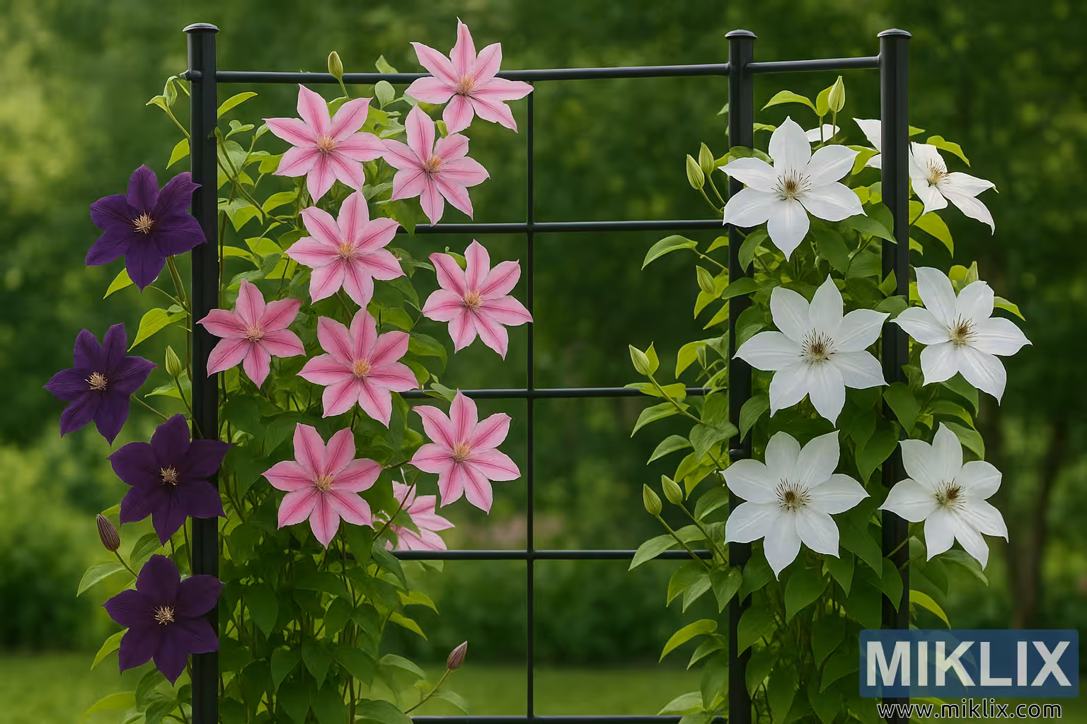 મધ્યમાં, ક્લેમેટિસ નેલી મોઝર ફૂલોનો સમૂહ નરમ, વધુ રોમેન્ટિક સ્વર રજૂ કરે છે. ઘાટા ગુલાબી મધ્ય પટ્ટાઓથી શણગારેલી તેમની નરમ ગુલાબી પાંખડીઓ તારા આકારની રચનામાં બહારની તરફ ફેલાય છે. આ આકર્ષક દ્વિ-રંગી અસર ઘાટા જાંબલી ફૂલો અને જમણી બાજુના વધુ સંયમિત સફેદ ફૂલો વચ્ચે દ્રશ્ય સંતુલન બનાવે છે. ગુલાબી ક્લેમેટિસ વેલા સુંદર ઉત્સાહ સાથે ટ્રેલીસ પર ચઢે છે, તેમના ફૂલો સ્તરોમાં ઓવરલેપ થાય છે જે પ્રદર્શનમાં પોત અને ઘનતા ઉમેરે છે.