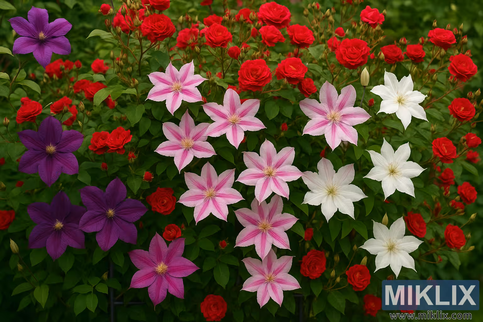 છબીમાં દર્શાવવામાં આવેલી ક્લેમેટિસ જાતો રંગોની મનમોહક શ્રેણી દર્શાવે છે. ડાબી બાજુ, ઘેરા જાંબલી ફૂલો તેમની મખમલી પાંખડીઓ ફેલાવે છે, તેમના સમૃદ્ધ સ્વર ઊંડાઈ અને વિરોધાભાસ પ્રદાન કરે છે. આ ફૂલો, તેમના પહોળા, સહેજ રફલ્ડ સેપલ્સ સાથે, આસપાસની હરિયાળી સામે હિંમતભેર ઉભા રહે છે. ફ્રેમના મધ્ય અને જમણા ભાગોમાં, નરમ ગુલાબી અને નિસ્તેજ મેજેન્ટા ક્લેમેટિસ ખીલે છે, જેમાંના ઘણા દરેક પાંખડીના મધ્યમાં ઘેરા પટ્ટાઓ સાથે ચાલે છે, રોમેન્ટિક વશીકરણ અને સ્વાદિષ્ટતાનો સ્પર્શ ઉમેરે છે. તેમના તારા આકારના સ્વરૂપ અને ભવ્ય સમપ્રમાણતા સમગ્ર રચનામાં પથરાયેલા શુદ્ધ સફેદ ક્લેમેટિસ ફૂલોના ઝુંડ દ્વારા પૂરક છે, જે હળવાશ અને તાજગીની ભાવના આપે છે. આ રંગો - ઊંડા જાંબલી, નરમ ગુલાબી અને ચપળ સફેદ - ની આંતરક્રિયા એક ચિત્રાત્મક અસર બનાવે છે, જે કાલાતીત સુંદરતાની લાગણી ઉજાગર કરે છે.