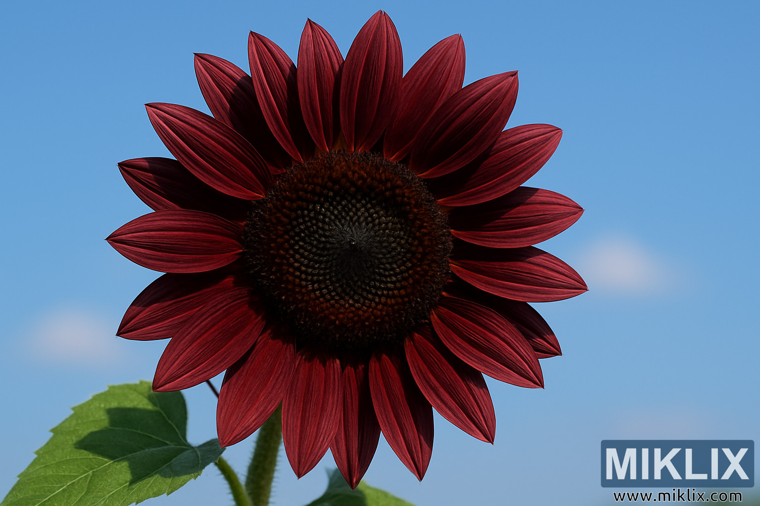 ચોકલેટ ચેરી સૂર્યમુખીનો એક આકર્ષક ક્લોઝ-અપ ફોટોગ્રાફ, જે તેની ઊંડા બર્ગન્ડી પાંખડીઓ, ઘેરા રંગનું કેન્દ્ર અને સ્વચ્છ ઉનાળાના આકાશ હેઠળ અસામાન્ય રંગ દર્શાવે છે.