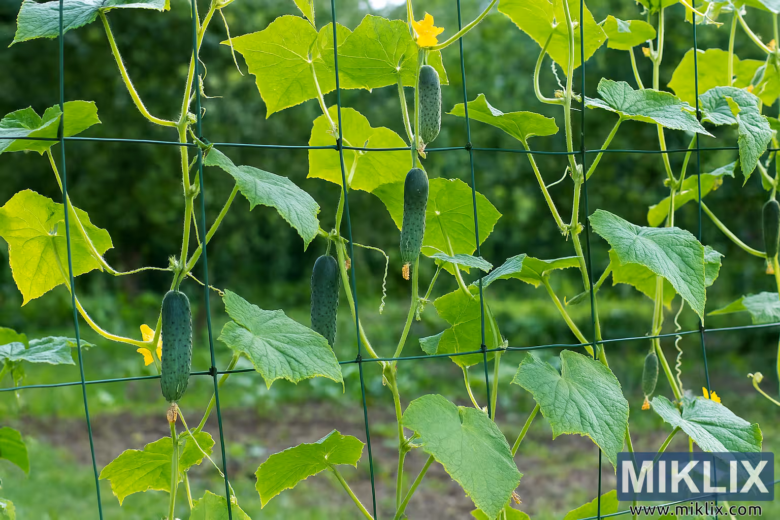 એક જીવંત બગીચામાં ટ્રેલીસ સિસ્ટમ પર ઊભી રીતે ઉગતા કાકડીના છોડની ઉચ્ચ-રિઝોલ્યુશન છબી, જે સ્વસ્થ પાંદડા, ફૂલો અને પાકતા કાકડીઓ દર્શાવે છે.