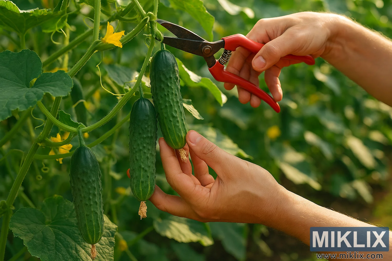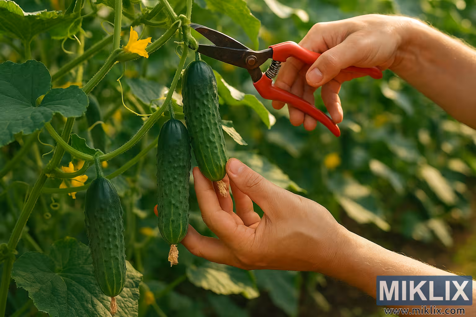 એક ઉચ્ચ-રિઝોલ્યુશન લેન્ડસ્કેપ ફોટોગ્રાફ લીલાછમ, સૂર્યપ્રકાશવાળા બગીચામાં કાકડી કાપવાની ક્ષણને કેદ કરે છે. કેન્દ્રિય ધ્યાન હાથની જોડી પર છે - સહેજ ટેન કરેલા, દૃશ્યમાન નસો અને ટૂંકા, સ્વચ્છ નખ સાથે - જે એક સમૃદ્ધ વેલામાંથી પાકેલા કાકડીઓ કાપવાના ચોક્કસ કાર્યમાં રોકાયેલા છે. ડાબો હાથ ધીમેધીમે ઊંડા લીલા કાકડીને પકડે છે, તેની રચનાવાળી ત્વચા થોડી ખરબચડી અને મેટ છે, જ્યારે જમણા હાથમાં કાળા, વળાંકવાળા બ્લેડ સાથે લાલ-હેન્ડલ કાપણી કાતરની જોડી છે જે ઉપર બીજી કાકડીના દાંડીને કાપી નાખે છે. નજીકમાં એક ત્રીજો કાકડી લટકેલો છે, ત્રણેય તેમના છેડા પર સૂકા, ભૂરા ફૂલોના અવશેષો દર્શાવે છે, જે સંપૂર્ણ પાકવાની સ્થિતિ દર્શાવે છે.