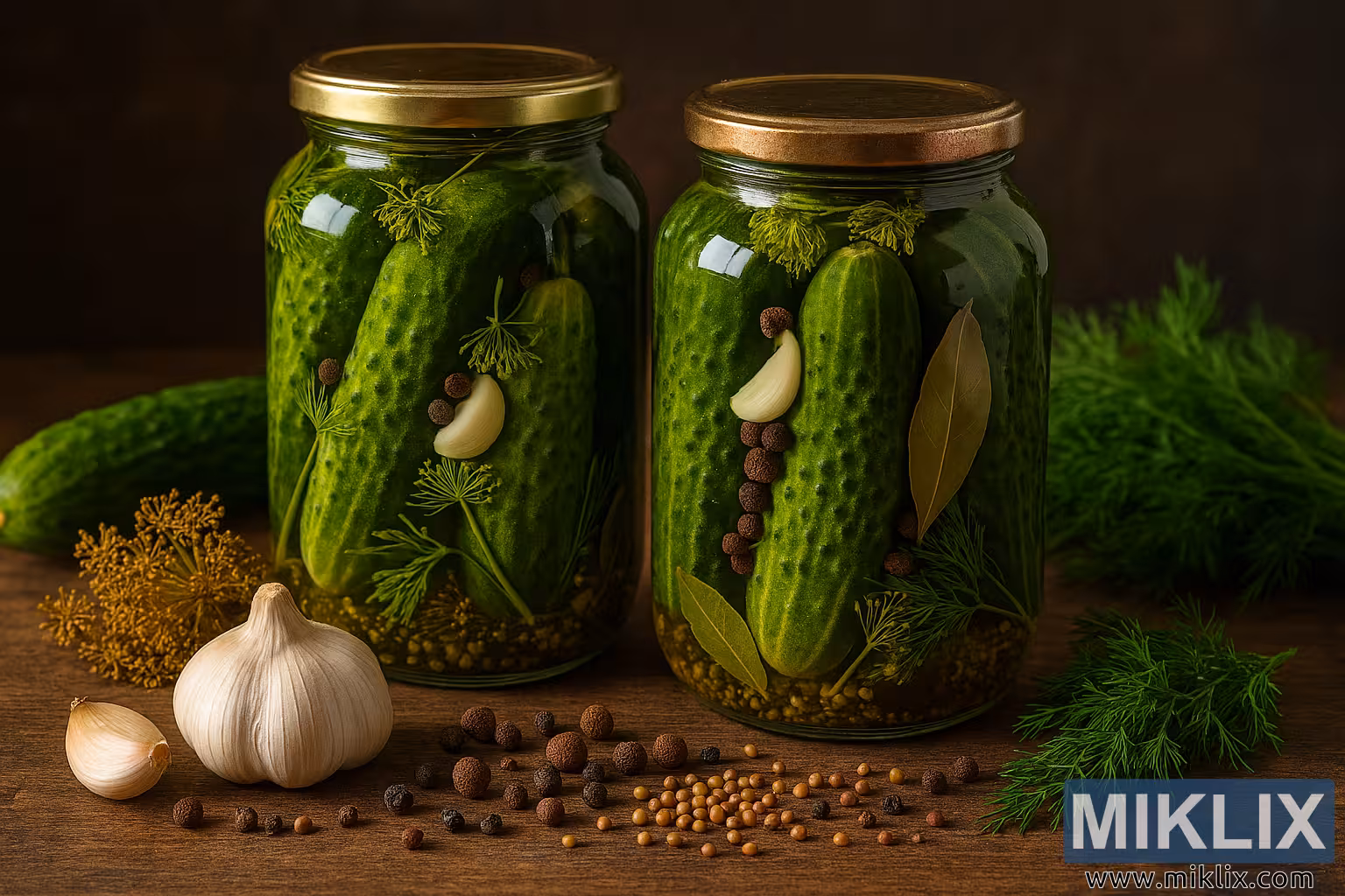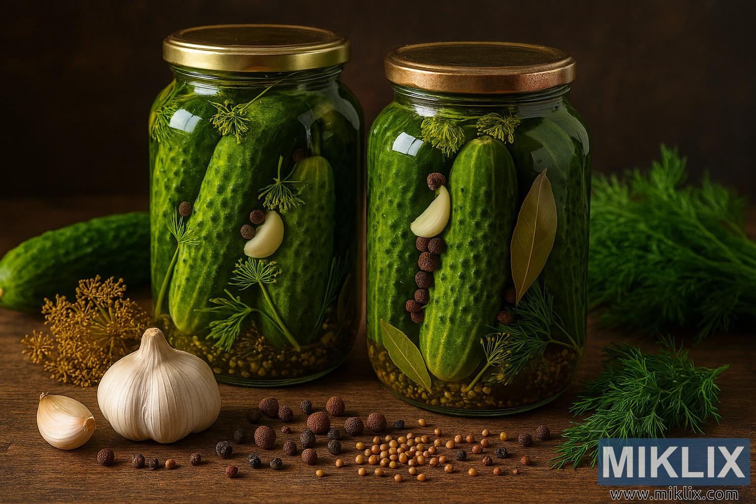એક ઝીણવટપૂર્વક રચાયેલ, ઉચ્ચ-રિઝોલ્યુશન, લેન્ડસ્કેપ ફોટોગ્રાફમાં તાજા અથાણાંવાળા કાકડીઓના બે મોટા કાચના બરણીઓ એક ઘસાઈ ગયેલી, ગામઠી લાકડાની સપાટી પર કેદ કરવામાં આવ્યા છે, જે અથાણાંના મસાલા અને સુગંધિત પદાર્થોના ક્લાસિક પેલેટથી ઘેરાયેલા છે. પહોળા મોં અને ચુસ્તપણે સીલબંધ ધાતુના ઢાંકણા (એક ગરમ સોનું, બીજું જૂનું તાંબુ) સાથે નળાકાર બરણીઓ, મધ્યમાં બાજુમાં બેસે છે. સ્પષ્ટ કાચ અને અર્ધપારદર્શક ખારા દ્વારા, કાકડીઓની ઊંડા, જીવંત લીલી ઘેરા, ટેક્ષ્ચર પૃષ્ઠભૂમિ સામે પોપ કરે છે. તેમની ચામડી સૂક્ષ્મ ડિમ્પલ્સ અને ઝાંખા રંગ ભિન્નતા સાથે કુદરતી ખાડાવાળી રચના દર્શાવે છે, જે તાજગી અને હાથની પસંદગી દર્શાવે છે. ઊભી પેકિંગ સ્વચ્છ રેખાઓ બનાવે છે જે આંખને ઉપર તરફ ખેંચે છે; કાકડીઓ વચ્ચે સુવાદાણા દોરાનાં દાણાદાર ડાળીઓ, પીંછા જેવા વિરોધાભાસ ઉમેરે છે.