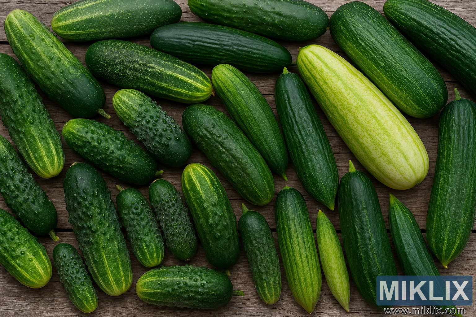 એક ઉચ્ચ-રિઝોલ્યુશન લેન્ડસ્કેપ ફોટોગ્રાફમાં એક સમૃદ્ધ ઘરના બગીચામાંથી તાજી રીતે ચૂંટાયેલી વિવિધ કાકડીઓની જાતોના વિપુલ પાકને કેદ કરવામાં આવ્યો છે. આ રચના બાગાયતી વિગતોથી ભરપૂર છે, જે ગામઠી લાકડાની સપાટી પર ગોઠવાયેલા કાકડીઓની વિશાળ શ્રેણી દર્શાવે છે જે ફ્રેમમાં આડી રીતે ચાલે છે.