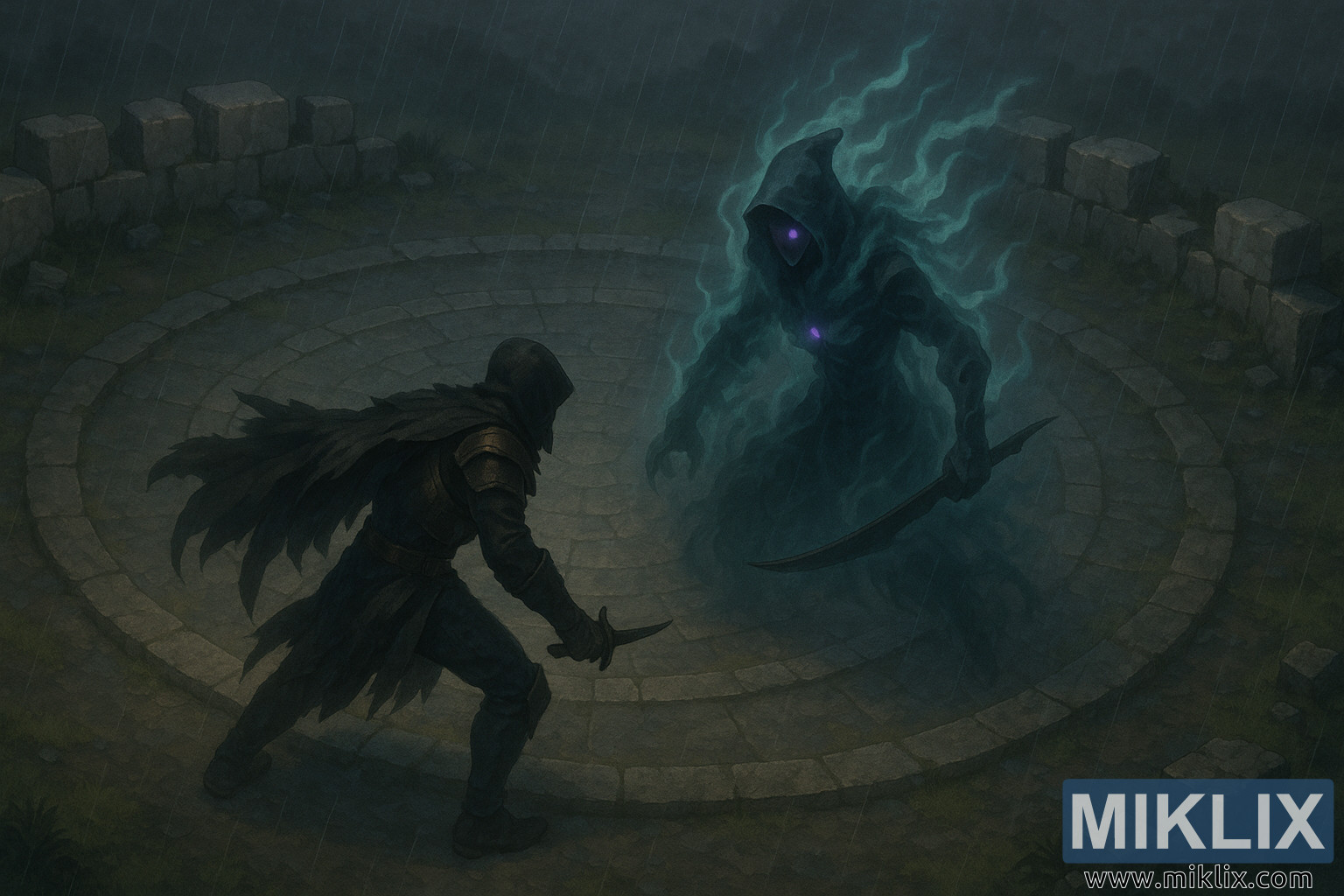 આ છબી ભારે વરસાદ હેઠળ ગોળાકાર પથ્થરના મેદાનમાં ઉદ્ભવતા ભયાનક દ્વંદ્વયુદ્ધનું વિશાળ, લેન્ડસ્કેપ-લક્ષી, અર્ધ-વાસ્તવિક ચિત્રણ દર્શાવે છે. કેમેરાને પાછળ ખેંચીને ઉંચો કરવામાં આવ્યો છે, જે સ્પષ્ટ આઇસોમેટ્રિક પરિપ્રેક્ષ્ય બનાવે છે જે લડવૈયાઓ અને તેમની આસપાસના વાતાવરણ બંને પર ભાર મૂકે છે. મેદાનનું માળખું ઘસાઈ ગયેલા પથ્થરના કેન્દ્રિત રિંગ્સથી બનેલું છે, જે વરસાદથી ચીકણું અને વય દ્વારા અંધારું થઈ ગયું છે. પથ્થરો વચ્ચેના છીછરા ખાડા અને ભીના સીમ વાદળછાયું આકાશમાંથી આછું પ્રતિબિંબ મેળવે છે. પરિમિતિની આસપાસ, તૂટેલા પથ્થરના બ્લોક્સ અને નીચી, ભાંગી પડેલી દિવાલો ઘાસ અને કાદવના પેચમાંથી બહાર આવે છે, જે આંશિક રીતે ઝાકળ અને પડછાયા દ્વારા ગળી જાય છે, જે એકલતા અને સડોની ભાવનાને મજબૂત બનાવે છે.