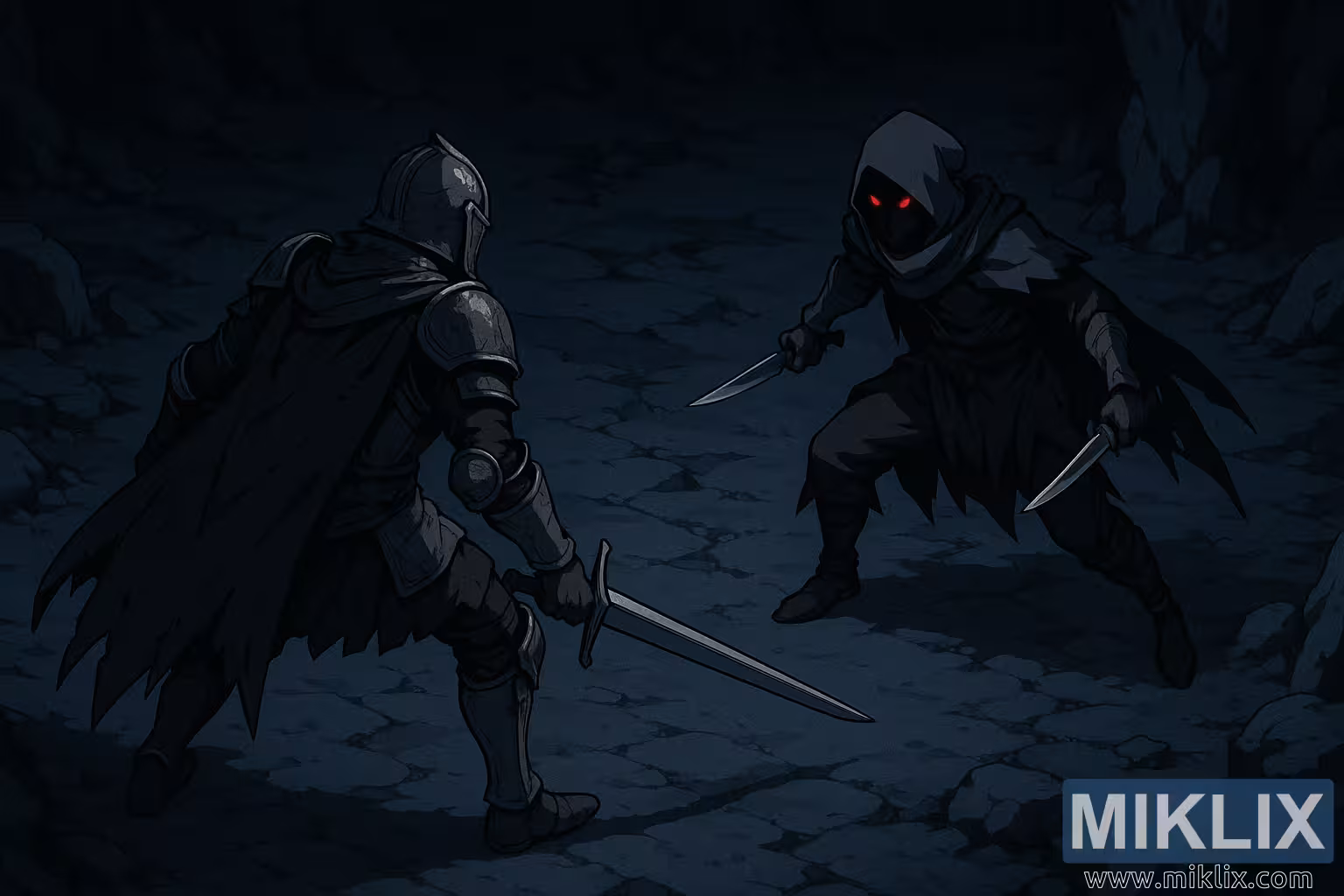 એનાઇમથી પ્રેરિત એલ્ડેન રિંગ ફેન આર્ટ, જેમાં ટાર્નિશ્ડનો આઇસોમેટ્રિક પરિપ્રેક્ષ્ય દર્શાવવામાં આવ્યો છે, જે એક પડછાયા ગુફામાં બે ખંજર ચલાવતા બ્લેક નાઇફ એસેસિનનો સામનો કરી રહ્યો છે.