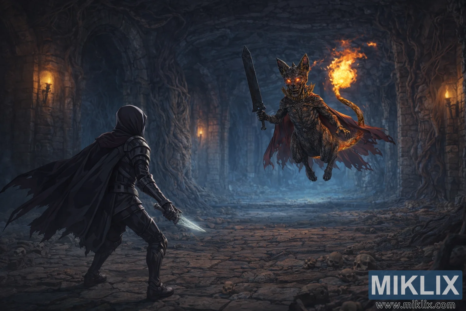 આ છબી ક્લિફબોટમ કેટાકોમ્બ્સની અંદર ઊંડાણમાં તણાવપૂર્ણ મુકાબલાનું વિશાળ, સિનેમેટિક એનાઇમ-શૈલીનું દૃશ્ય રજૂ કરે છે. આસપાસના વાતાવરણને વધુ ઉજાગર કરવા માટે કેમેરાને પાછળ ખેંચવામાં આવ્યો છે, જે ભૂગર્ભ અંધારકોટડીના સ્કેલ અને વાતાવરણ પર ભાર મૂકે છે. કેટાકોમ્બ્સ પૃષ્ઠભૂમિમાં કમાનવાળા પથ્થરના કોરિડોર, ખરબચડી દિવાલો અને છત અને થાંભલાઓ સાથે ક્રોલ કરતા જાડા, વળાંકવાળા મૂળ દ્વારા ઓવરટેક કરાયેલ પ્રાચીન ચણતર સાથે ફેલાયેલા છે. દિવાલ પર લગાવેલા સ્કોન્સમાંથી ઝાંખી ટોર્ચલાઇટ ઝબકતી હોય છે, ગરમ નારંગી ચમક ફેંકે છે જે ચેમ્બરને ભરી રહેલા ઠંડા, વાદળી આસપાસના પ્રકાશથી વિપરીત છે. પથ્થરનું ફ્લોર તિરાડ અને અસમાન છે, કાટમાળ અને માનવ ખોપરીઓથી પથરાયેલું છે જે પહેલા આવેલા અસંખ્ય શહીદ સાહસિકોનો સંકેત આપે છે.