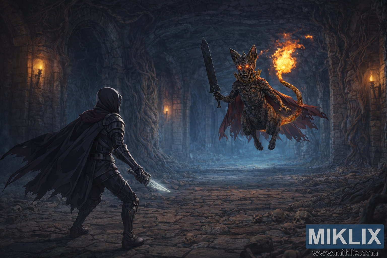 વોચડોગની પૂંછડી તેજસ્વી, જીવંત જ્યોતથી ઘેરાયેલી છે, તેની પાછળ વળે છે અને આસપાસના પથ્થરને ચમકતા નારંગી પ્રકાશથી પ્રકાશિત કરે છે. અગ્નિ દિવાલો, મૂળ અને ફ્લોર પર ગતિશીલ પડછાયાઓ ફેંકે છે, જેનાથી ચેમ્બર જીવંત અને અસ્થિર લાગે છે. કેટાકોમ્બ્સના ઠંડા વાદળી ટોન અને જ્વાળાઓના ગરમ તેજ વચ્ચેનો વિરોધાભાસ દ્રશ્યના નાટકીય તણાવને વધારે છે.