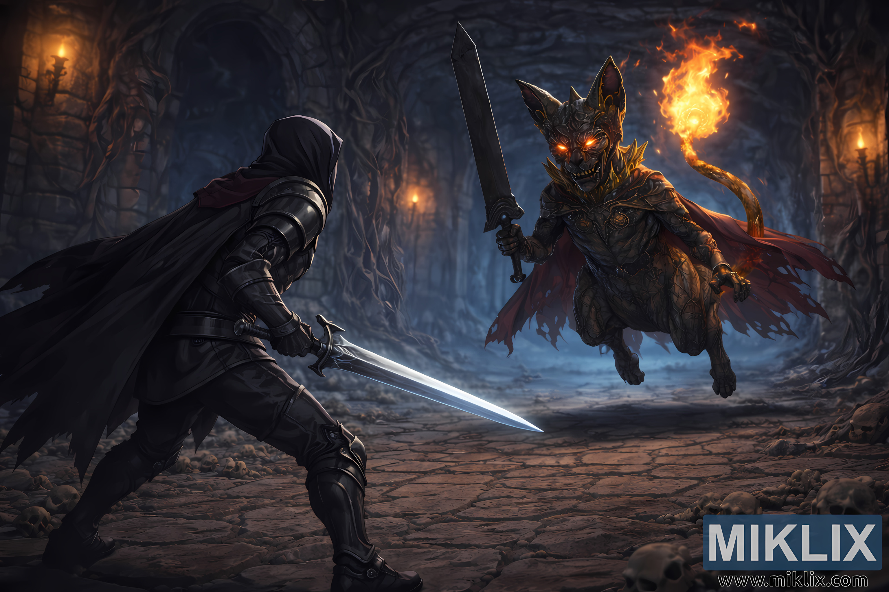તેની જ્વલંત પૂંછડી તેની પાછળ ચાપ લગાવે છે, જે તેજસ્વી, જીવંત અગ્નિથી ઘેરાયેલી છે. જ્વાળાઓ દિવાલો અને ફ્લોર પર ગતિશીલ, ઝબકતો પ્રકાશ ફેંકે છે, જેના કારણે મૂળ અને પથ્થરકામ પર પડછાયાઓ સળવળવા લાગે છે. અગ્નિની ગરમી અંધારકોટડીના ઠંડા વાદળી ટોન સાથે દૃષ્ટિની રીતે અથડાય છે, જે કેટકોમ્બ્સમાં વોચડોગની અકુદરતી હાજરીને મજબૂત બનાવે છે.