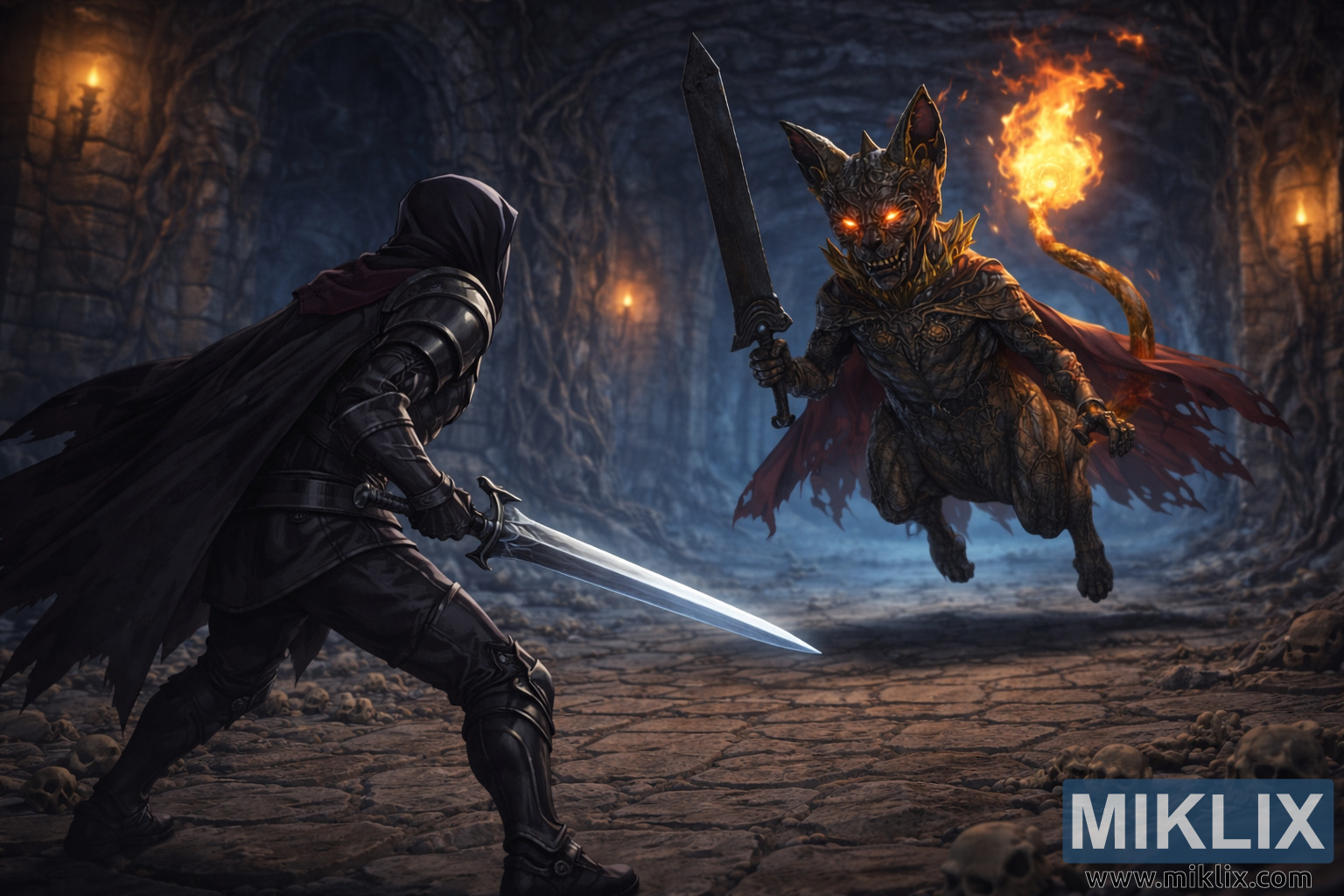 ડાબી બાજુના અગ્રભાગમાં કલંકિત ઉભો છે, જે હવે ખંજરને બદલે પૂર્ણ-લંબાઈની તલવાર ચલાવે છે. કલંકિત કાળા છરીના બખ્તરમાં સજ્જ છે, આકર્ષક અને ઘેરા, ગતિ અને ચોકસાઈ માટે રચાયેલ સ્તરવાળી પ્લેટો સાથે. સૂક્ષ્મ ધાતુની ધાર આસપાસના પ્રકાશને પકડી લે છે, જે અંધકાર સામે આકૃતિની રૂપરેખા આપે છે. તેમની પાછળ એક લાંબો, ફાટેલો ડગલો વહે છે, તેની ખરબચડી ધાર લાંબી મુસાફરી અને અવિરત લડાઈઓ સૂચવે છે. કલંકિતનું વલણ નીચું અને મજબૂત છે, પગ પથ્થરના ફ્લોર પર મજબૂત રીતે રોપાયેલા છે, શરીર નિકટવર્તી લડાઈની તૈયારીમાં આગળ કોણીય છે. તલવાર તેમની સામે ત્રાંસા રીતે રાખવામાં આવી છે, તેનો બ્લેડ ઠંડા, ચાંદીના ચમક સાથે ટોર્ચલાઇટને પ્રતિબિંબિત કરે છે જે તેની તીક્ષ્ણતા અને ઘાતક ઇરાદા પર ભાર મૂકે છે. હૂડ કલંકિતના ચહેરાને સંપૂર્ણપણે ઢાંકી દે છે, ફક્ત તેમના મુદ્રા અને શસ્ત્રોને તેમના ધ્યાન અને સંકલ્પને વ્યક્ત કરવા માટે છોડી દે છે.