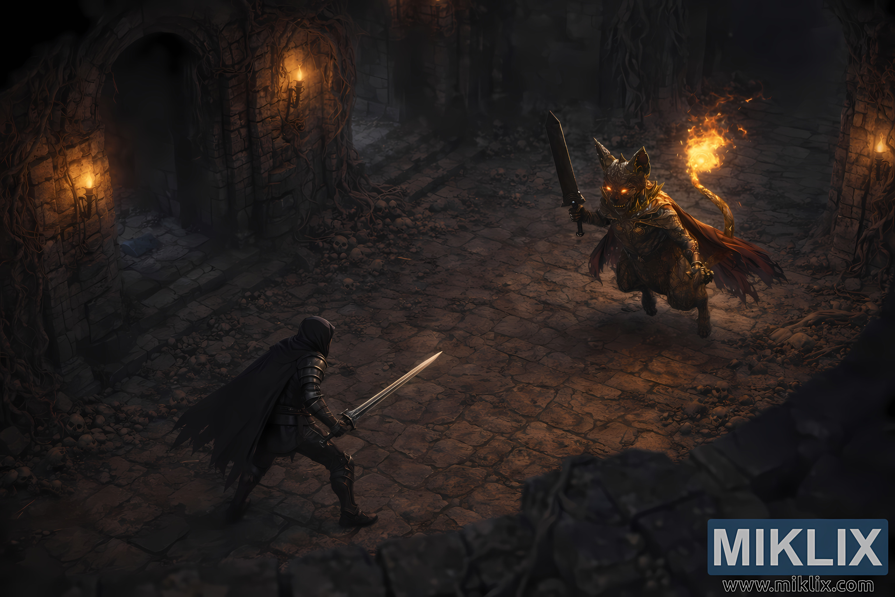 વોચડોગની જ્વલંત પૂંછડી તેજસ્વી રીતે બળે છે, ઉપર અને બહાર વળે છે, ફ્લોર અને નજીકની દિવાલો પર આબેહૂબ નારંગી પ્રકાશ ફેંકે છે. આગ તીવ્ર વિરોધાભાસ અને લાંબા, કોણીય પડછાયાઓ બનાવે છે જે આઇસોમેટ્રિક દૃશ્યની ભૂમિતિ પર ભાર મૂકે છે. પથ્થરના ફ્લોર પર છૂટાછવાયા ખોપરી અને હાડકાં ઉપરથી વધુ દૃશ્યમાન બને છે, જે ભયાનક પેટર્ન બનાવે છે જે બે લડવૈયાઓ વચ્ચેનો માર્ગ શોધી કાઢે છે અને એન્કાઉન્ટરના ભયને રેખાંકિત કરે છે.