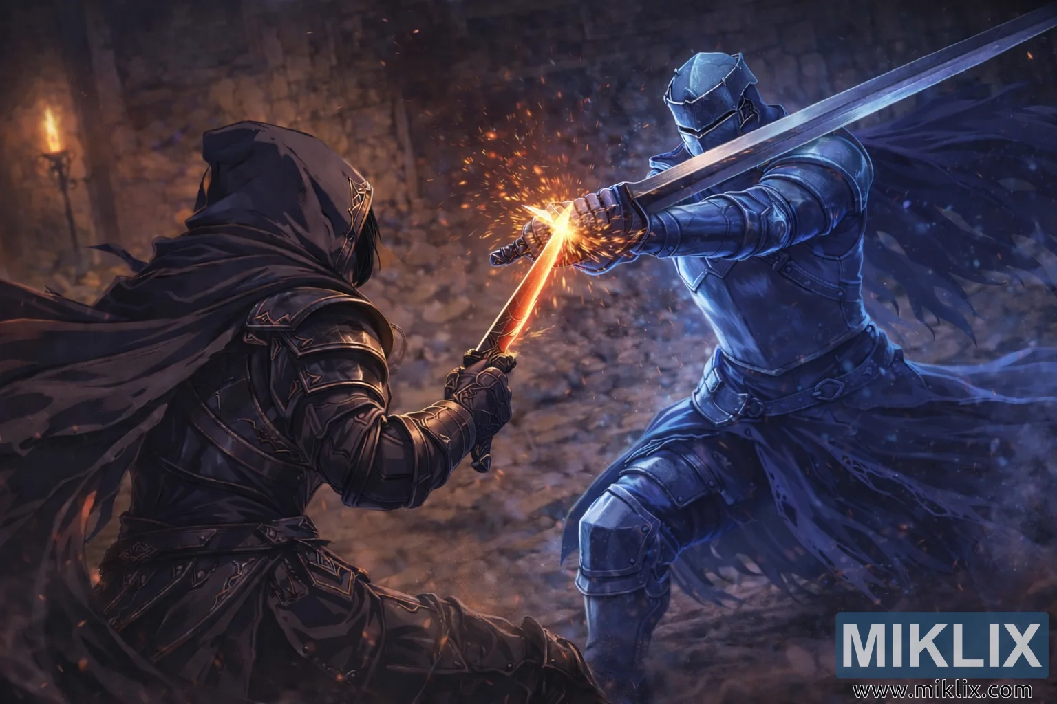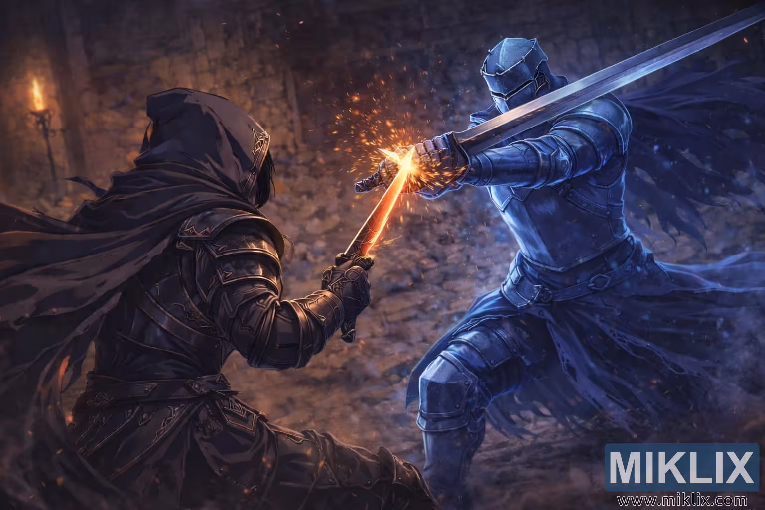 કલંકિતની સામે એકાંત જેલનો નાઈટ ઉભો છે, જે એક અલૌકિક વાદળી રંગથી ચિત્રિત છે જે આકૃતિને સ્પેક્ટ્રલ બનાવે છે, જાણે ચંદ્રપ્રકાશિત સ્ટીલમાંથી કોતરવામાં આવે છે. નાઈટનું બખ્તર ભારે અને વધુ પ્રભાવશાળી છે, પહોળા પાઉડ્રોન અને મજબૂત ગન્ટલેટ્સ સાથે, બધા ઠંડા વાદળી રંગમાં રંગાયેલા છે જે ખંજરની ગરમ ચમક સાથે તીવ્ર વિરોધાભાસી છે. નાઈટ ક્લાસિક બે-હાથવાળા વલણમાં પકડેલી એક લાંબી તલવાર ચલાવે છે - બંને હાથ હિલ્ટ પર બંધ છે, બ્લેડના વજન અને લીવરેજને નિયંત્રિત કરવા માટે હાથ લંબાવવામાં આવ્યા છે. તલવારની ધાર છબીના ઉપરના ભાગમાં ત્રાંસા રીતે ચાલે છે, એક મજબૂત રચનાત્મક રેખા બનાવે છે જે નાઈટના હેલ્મેટથી અસર બિંદુ સુધી આંખને માર્ગદર્શન આપે છે.