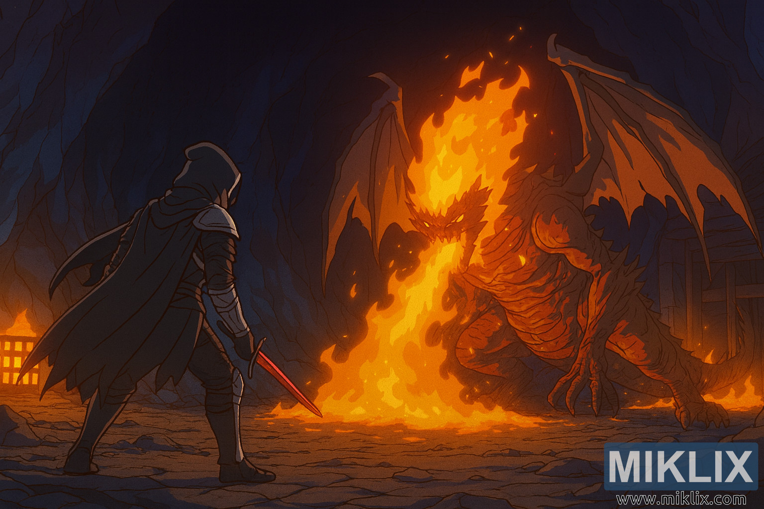 ગેલ ટનલમાં મેગ્મા વાયર્મનો સામનો કરતી ટાર્નિશ્ડની એનાઇમ-પ્રેરિત ચાહક કલા, એલ્ડેન રિંગમાં યુદ્ધની તંગ પ્રસ્તાવનાને કેદ કરે છે.