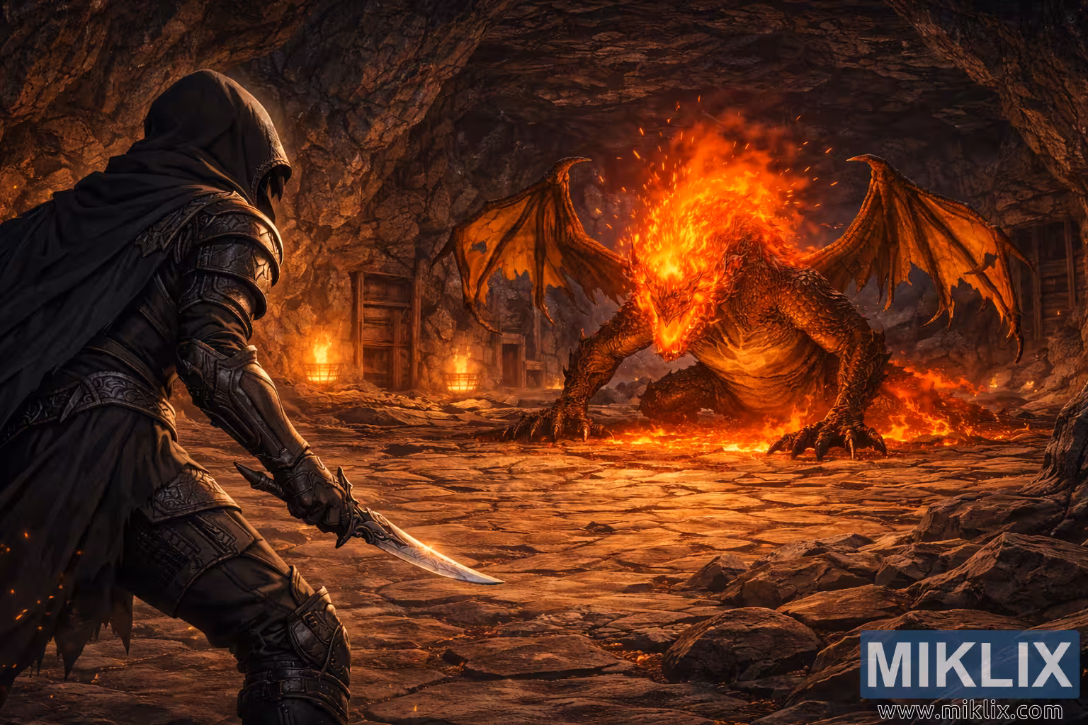વિસ્તૃત પૃષ્ઠભૂમિ ત્યજી દેવાયેલી ખાણકામ ટનલની વિગતોથી દ્રશ્યને સમૃદ્ધ બનાવે છે. ખરબચડી કોતરેલી ગુફાની દિવાલો ઉપર કમાન ધરાવે છે, જે કાજળ અને ગરમીના ડાઘથી છવાયેલી છે, જ્યારે તૂટેલા લાકડાના પાલખ અને જૂના ખાણના દરવાજા દૂર પથ્થર સાથે ચોંટી ગયા છે. લોખંડના બ્રેઝિયર દિવાલો સાથે નબળા રીતે બળે છે, તેમની નાની જ્વાળાઓ વાયર્મના અગ્નિથી વામન થઈ જાય છે, અને પડછાયાઓ કાટમાળના ઢગલા, રેલિંગ અને તૂટેલા પાટિયા પર ફ્લોર પર પથરાયેલા છે. ધુમાડો આળસુ સર્પાકારમાં ઉપર તરફ વહે છે, છતને ઝાંખી કરે છે અને ગુફામાં ધુમ્મસભરી ઊંડાઈ ઉમેરે છે.