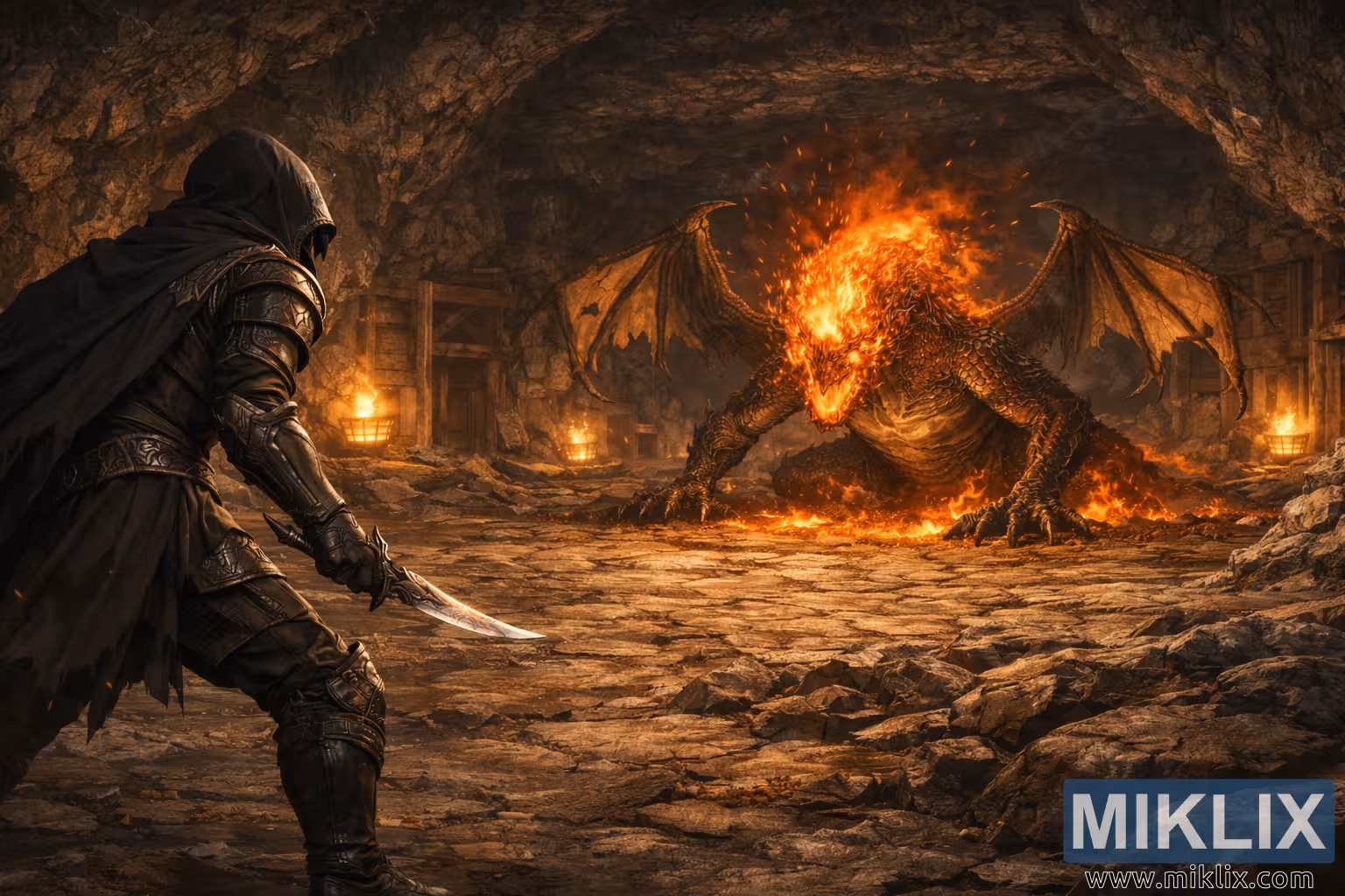 ગુફાના ફ્લોરની પેલે પાર, મેગ્મા વાયર્મ ફ્રેમની મધ્યમાં જમણી બાજુએ ઝૂકીને રહે છે, જે જીવંત ભઠ્ઠીની જેમ ગરમી ફેલાવે છે. તેનું વિશાળ શરીર તિરાડ, બેસાલ્ટ જેવા ભીંગડાથી ભરેલું છે, અંગો અને ખભા પર કાળા પડી ગયા છે પરંતુ છાતી, ગરદન અને ખોપરી પર અંદરથી ચમકી રહ્યું છે. તેના માથાની આસપાસની આગ શૈલીયુક્ત નથી પરંતુ ભારે અને હિંસક છે, જ્વાળાઓની જાડી જીભ બહાર ચાટતી હોય છે અને તણખાના વરસાદ ધુમાડાવાળી હવામાં વહે છે. વાયર્મની પાંખો ખુલ્લી, ફાટેલી અને ચામડા જેવી લટકતી હોય છે, તેમના પટલ સળગેલા અને ધારની નજીક અર્ધપારદર્શક હોય છે જ્યાંથી મેગ્મા પ્રકાશ લોહી વહે છે. તેના પંજા પથ્થરમાં ઘસીને લાવા ઉત્પન્ન કરે છે જે ધીમા, ચમકતા નાળાઓમાં જમીન પર ટપકતો હોય છે.