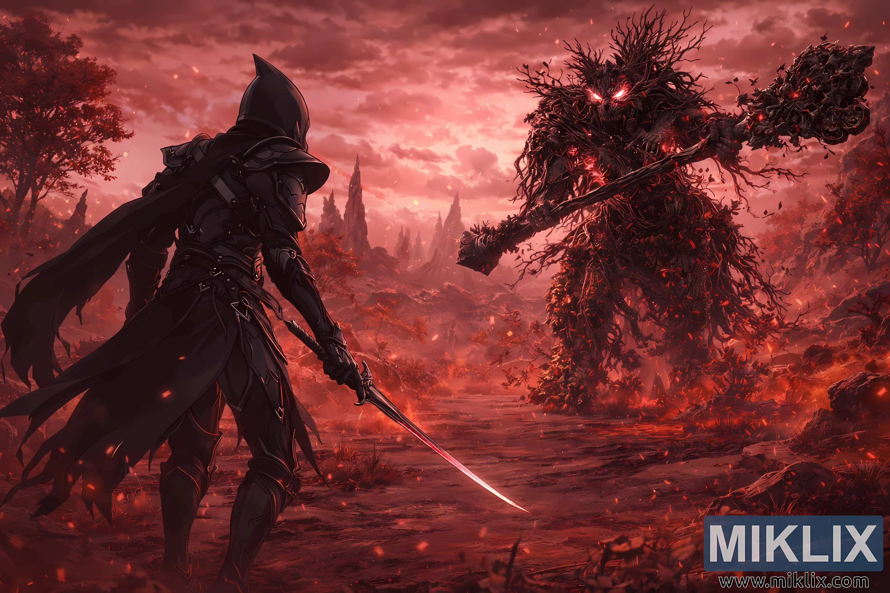એનાઇમ-શૈલીના ચાહક કલા દ્રશ્યમાં કેલિડના શાપિત ભૂમિમાં યુદ્ધ પહેલાંની તંગ શાંતિને કેદ કરવામાં આવી છે. આ છબી વિશાળ, સિનેમેટિક લેન્ડસ્કેપમાં સેટ કરવામાં આવી છે, જે આકાશમાં કિરમજી વાદળોથી ઘેરાયેલી છે જે દૂરના આગથી અંદરથી પ્રકાશિત થાય છે. રાખ અને અંગારા જેવા કણો હવામાં વહે છે, જે એવી લાગણી પેદા કરે છે કે જમીન પોતે જ બળી રહી છે અથવા ધીમી ગતિમાં ક્ષીણ થઈ રહી છે. ડાબી બાજુના ફોરગ્રાઉન્ડમાં કલંકિત ઉભો છે, પાછળથી અને સહેજ બાજુ તરફ જોવામાં આવે છે, તે આકર્ષક કાળા છરીના બખ્તરમાં સજ્જ છે. બખ્તર શ્યામ અને મેટ છે જેમાં સૂક્ષ્મ ધાતુની ધાર છે, તેની વિભાજિત પ્લેટો પડછાયાના શેલની જેમ શરીરની નજીક ફિટ થાય છે. એક લાંબો, ફાટેલો ડગલો ગરમ પવનમાં પાછળની તરફ વહે છે, અને કલંકિત એક હાથમાં પાતળો વક્ર ખંજર ધરાવે છે, લાલ વાતાવરણ સામે ઠંડા પ્રકાશથી આછું ચમકતું બ્લેડ. વલણ આક્રમક કરતાં સાવધ છે, ઘૂંટણ સહેજ વળેલું છે અને ખભા કોણીય છે, જે સૂચવે છે કે યોદ્ધા અંતર અને આગળના ભયને માપી રહ્યો છે. સળગેલા માર્ગ પર, રચનાની જમણી બાજુ પર પ્રભુત્વ ધરાવે છે, પુટ્રિડ અવતારને ઉંચો કરે છે. આ રાક્ષસી આકૃતિ જાણે જમીનમાંથી જ ઉગી નીકળી હોય તેવું લાગે છે: તેનું શરીર છાલ, મૂળ અને સડેલા લાકડાનો વળેલો સમૂહ છે, જે બીમાર કિરમજી ઊર્જાના ચમકતા તિરાડોથી દોરેલા છે. તેની આંખો ખોખલા લાકડાના ચહેરામાં ઊંડા કોલસાની જેમ બળે છે, અને તેના વિશાળ હાથ સંકુચિત મૂળ અને પથ્થરમાંથી બનેલા ગઠ્ઠા જેવા, ક્લબ જેવા હથિયારમાં સમાપ્ત થાય છે. પાંદડા, સડો અને અંગારાના ટુકડા પ્રાણીની આસપાસ ફરે છે, જાણે કે તેને જીવંત બનાવતો ભ્રષ્ટાચાર તેના પોતાના ફ્રેમમાં સમાવી શકાતો નથી. બે આકૃતિઓ વચ્ચેની જમીન એક તિરાડ, લોહી-લાલ રસ્તો છે જે મૃત ઘાસ અને વિકૃત વૃક્ષોના ખેતરોમાંથી પસાર થાય છે જેની હાડપિંજરની શાખાઓ આકાશ તરફ પંજા મારે છે. મધ્ય અંતરમાં, ખડકના તીક્ષ્ણ શિખરો તૂટેલા દાંતની જેમ ઉભા થાય છે, જે ચમકતા ક્ષિતિજ સામે સિલુએટ કરેલા છે. ગતિ પહેલાંની ક્ષણ પર ભાર મૂકવા માટે રચના સંતુલિત છે: કોઈ પણ લડવૈયાએ હજી સુધી હુમલો કર્યો નથી, પરંતુ તેમની વચ્ચેની હવા અનિવાર્યતાથી ભરેલી લાગે છે. ગરમ લાલ અને કાળા રંગ પેલેટ પર પ્રભુત્વ ધરાવે છે, બખ્તર પર સૂક્ષ્મ હાઇલાઇટ્સ અને લાકડા ઊંડાઈ અને પોત આપે છે. એકંદર અસર નાટકીય અને ભયાનક છે, જે યુદ્ધની અંધાધૂંધીનું ચિત્રણ નથી કરતી, પરંતુ તે ભારે, શ્વાસ રોકી દે તેવી ક્ષણ દર્શાવે છે જ્યારે કલંકિત અને રાક્ષસ બંને એકબીજાને જીવલેણ ખતરા તરીકે ઓળખે છે અને તેમની પાસે જે કંઈ છે તે બધું બહાર કાઢવાની તૈયારી કરે છે.